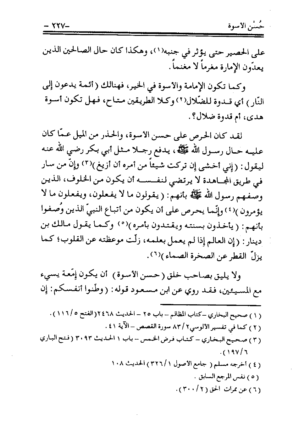 لقد كان الحرص على حسن الأسوة، والحذر من الميل عمّا كان عليه حال رسول الله - صلى الله عليه وسلم -، يدفع رجلًا مثل أبي بكر - رضي الله عنه - ليقول: (إني أخشى إن تركت شيئًا من أمره أن أزيغ) (¬3)، وإن من سار في طريق المجاهدة لا يرتضي لنفسه أن يكون من الخلوف، الذين وصفهم رسول الله - صلى الله عليه وسلم - بأنهم: «يقولون ما لا يفعلون، ويفعلون ما لا يؤمرون» (¬4)، وإنما يحرص على أن يكون من أتباع النبي الذين وُصفوا بأنهم: (يأخذون بسنته ويقتدون بأمره) (¬5)، وكما يقول مالك بن دينار: «إن العالم إذا لم يعمل بعلمه، زلَّت موعظته عن القلوب؛ كما يزلُّ القطر عن الصخرة الصماء» (¬6).