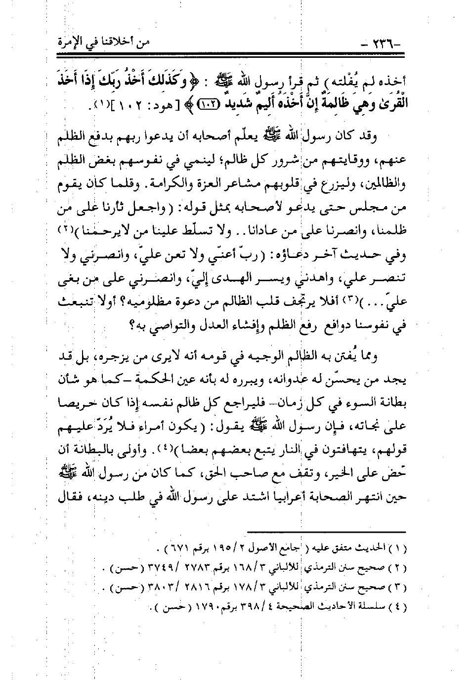 وقد كان رسول الله - صلى الله عليه وسلم - يُعلِّم أصحابه أن يدعوا ربهم بدفع الظلم عنهم، ووقايتهم من شرور كل ظالم؛ لينمي في نفوسهم بغض الظلم والظالمين، وليزرع في قلوبهم مشاعر العزة والكرامة، وقلما كان يقوم من مجلس حتى يدعو لأصحابه بمثل قوله: «واجعل ثأرنا على من ظلمنا، وانصرنا على من عادانا .. ولا تسلِّط علينا من لا يرحمنا» (¬2)، وفي حديث آخر دعاؤه: «ربِّ أعنِّي ولا تُعِن عليَّ، وانصرني ولا تنصر علي، واهدني ويسر الهدى إليَّ، وانصرني على من بغى عليَّ ...» (¬3)، أفلا يرتجف قلب الظالم من دعوة مظلوميه؟ أو لا تنبعث في نفوسنا دوافع رفع الظلم وإفشاء العدل والتواصي به؟