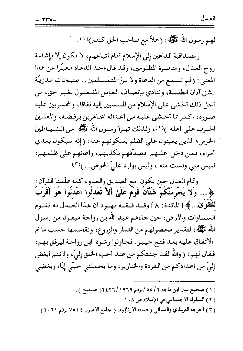 وتمام العدل حين يكون مع الصديق والعدو، كما علّمنا القرآن: {وَلَا يَجْرِمَنَّكُمْ شَنَآَنُ قَوْمٍ عَلَى أَلَّا تَعْدِلُوا اعْدِلُوا هُوَ أَقْرَبُ لِلتَّقْوَى} [المائدة: 8] وقد فقه يهود أن هذا العدل به تقوم السماوات والأرض، حين جاءهم عبد الله بن رواحة مبعوثًا من رسول الله - صلى الله عليه وسلم -؛ لتقدير محصولهم من الثمار والزروع، وتقاسمها حسب ما تم الاتفاق عليه بعد فتح خيبر، فحاولوا رِشوة ابن رواحة ليرفق بهم، فقال لهم: «والله لقد جئتكم من عند أحب الخلق إليَّ، ولأنتم أبغض إليَّ من أعدائكم من القردة والخنازير، وما يحملني حبِّي إيَّاه وبغضي