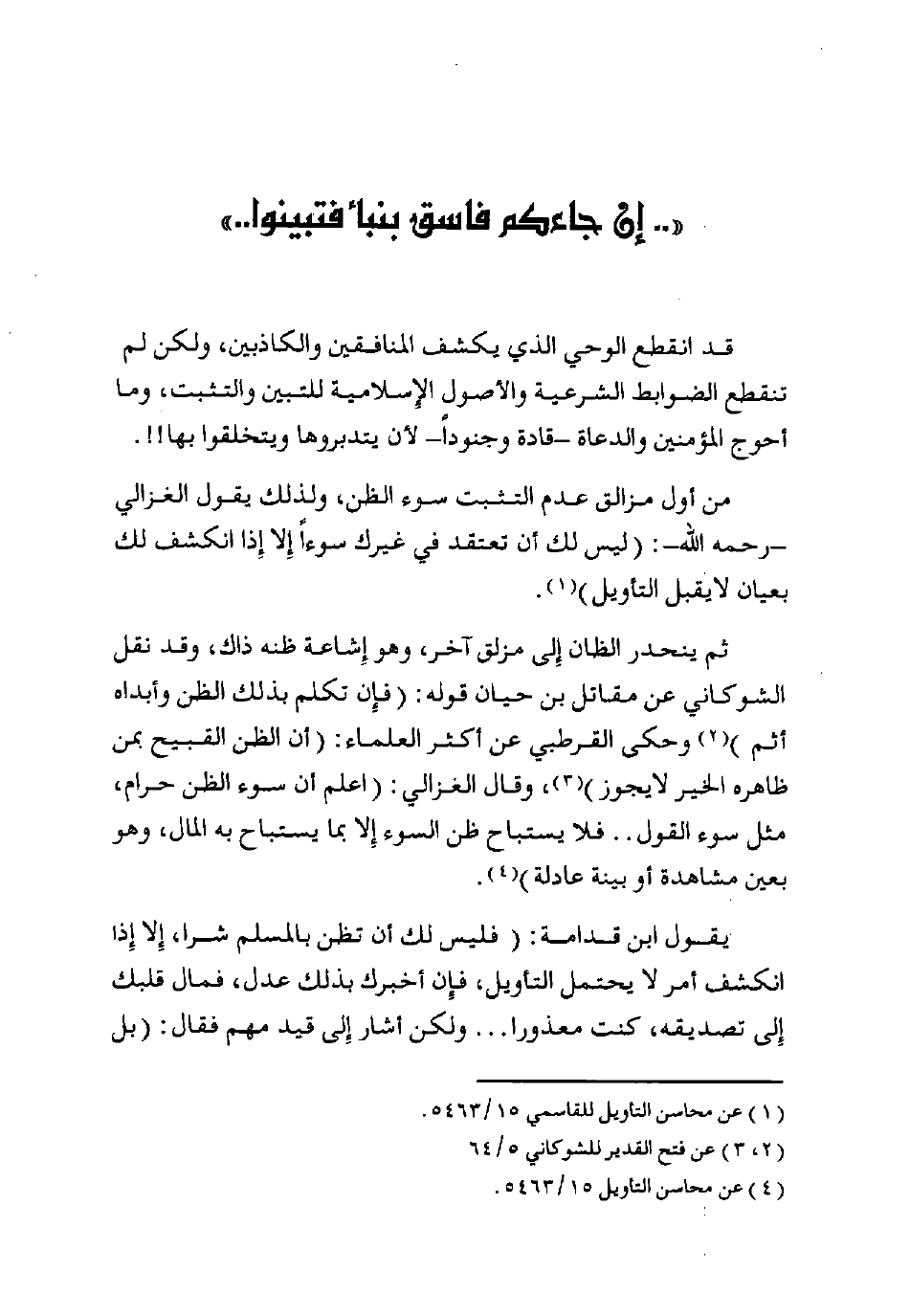 يقول ابن قدامة: (فليس لك أن تظن بالمسلم شرًّا، إلا إذا انكشف أمر لا يحتمل التأويل، فإن أخبرك بذلك عدل، فمالَ قلبك إلى تصديقه، كنت معذورًا ... ولكن أشار إلى قيد مهم فقال: «بل