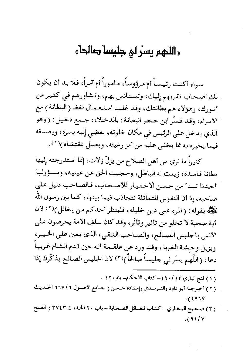 كثيرًا ما نرى من أهل الصلاح من يزل زلات، إنما استدرجته إليها بطانة فاسدة، زينت له الباطل، وحجبت الحق عن عينيه، ومسؤولية أحدنا تبدأ من حسن الاختيار للأصحاب، فالصاحب دليل على صاحبه؛ إذ إن النفوس المتماثلة تتجاذب فيما بينها، كما بيَّن رسول الله - صلى الله عليه وسلم - بقوله: «المرء على دين خليله، فلينظر أحدكم من يخالل» (¬2)؛ لأن أية صحبة لا تخلو من تأثير وتأثر، وقد كان سلف الأمة يحرصون على الأنس بالجليس الصالح، والصاحب التقي، الذي يعني على الخير، ويزيل وحشة الغربة، وقد ورد عن علقمة أنه حين قدم الشام غريبًا دعا: (اللهم يسر لي جليسًا صالحًا) (¬3)؛ لأن الجليس الصالح يذكرك إذا