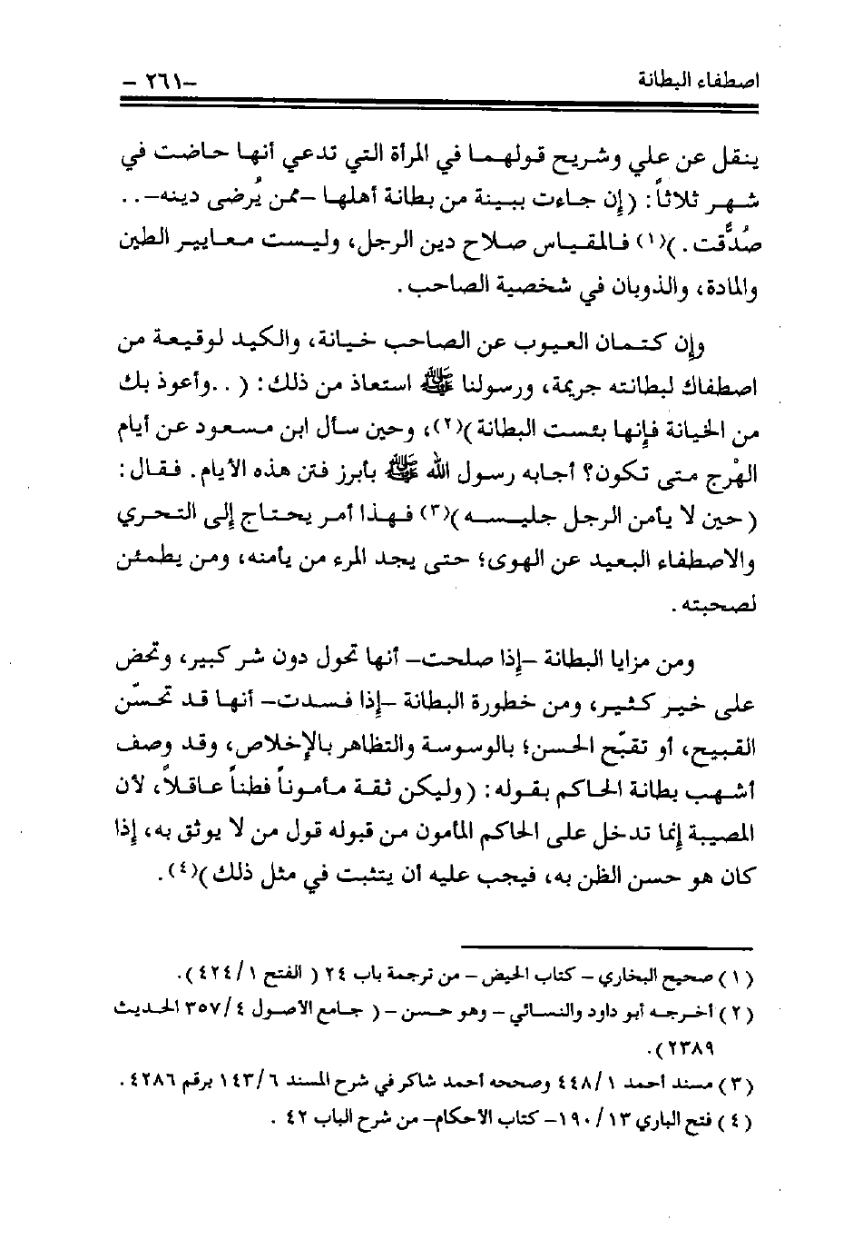 ينقل عن علي وشريح قولهما في المرأة التي تدعي أنها حاضت في شهر ثلاثًا: (إن جاءت ببينة من بطانة أهلها - ممن يرضي دينه - .. صدقت.) (¬1)، فالمقياس صلاح دين الرجل، وليست معايير الطين والمادة، والذوبان في شخصية الصاحب.