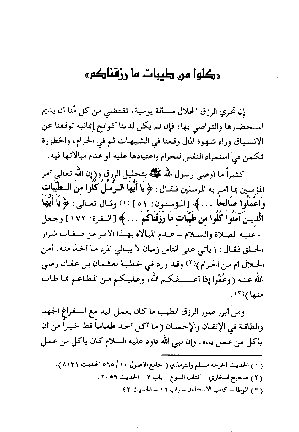كثيرًا ما أوصى رسول الله - صلى الله عليه وسلم - بتحليل الرزق و «إن الله تعالى أمر المؤمنين بما أمر به المرسلين فقال: {يَا أَيُّهَا الرُّسُلُ كُلُوا مِنَ الطَّيِّبَاتِ وَاعْمَلُوا صَالِحًا ...} [المؤمنون: 51] (¬1)، وقال تعالى: {يَا أَيُّهَا الَّذِينَ آَمَنُوا كُلُوا مِنْ طَيِّبَاتِ مَا رَزَقْنَاكُمْ ...} [البقرة: 172]» وجعل - عليه الصلاة والسلام - عدم المبالاة بهذا الأمر من صفات شرار الخلق فقال: «يأتي على الناس زمان لا يُبالِي المرء ما أخذ منه، أمن الحلال أم من الحرام» (¬2)، وقد ورد في خطبة لعثمان بن عفان - رضي الله عنه - (وعفُّوا إذا أعفَّكم الله، وعليكم من المطاعم بما طاب منها) (¬3).