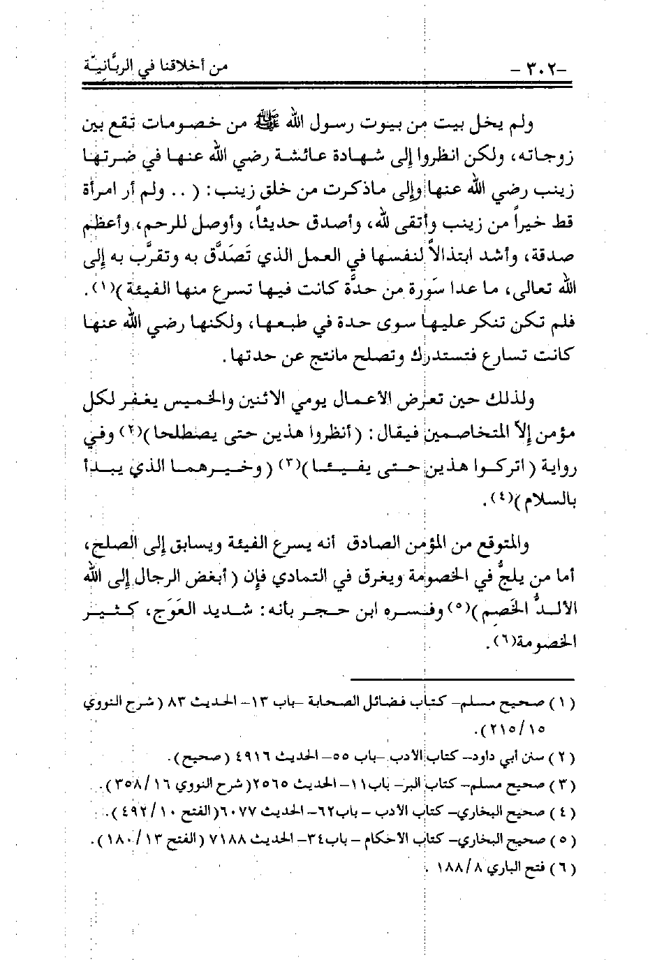 ولم يخلُ بيتٌ من بيوت رسول الله - صلى الله عليه وسلم - من خصومات تقع بين زوجاته، ولكن انظروا إلى شهادة عائشة رضي الله عنها في ضرتها زينب رضي الله عنها وإلى ما ذكرت من خُلُق زينب: (ولم أر امرأة قط خيرًا من زينب وأتقى لله، وأصدق حديثًا، وأوصل للرحم، وأعظم صدقة، وأشد ابتذالاً لنفسها في العمل الذي تصدق به وتقرب إلى الله تعالى، ما عدا سورة من حدة كانت فيها تسرع منها الفيئة) (¬1).