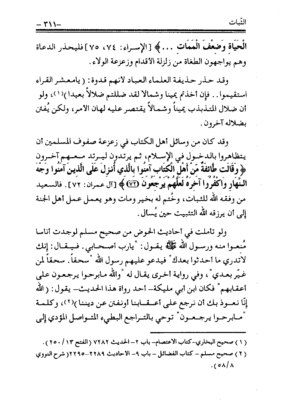 ولو تأملت في أحاديث الحوض من صحيح مسلم لوجدت أناسًا مُنعوا منه ورسول الله - صلى الله عليه وسلم - يقول: «يا رب أصحابي، فيقال: إنك لا تدري ما أحدثوا بعدك»، فيدعو عليهم رسول الله «سحقًا سحقًا لمن غير بعدي»، وفي رواية أخرى يقال له «والله ما برحوا يرجعون على أعقابهم»، فكان ابن أبي مُلَيكة - أحد رواة هذا الحديث - يقول: (اللهم إنا نعوذ بك أن نرجع على أعقابنا أو نفتن عن ديننا) (¬2)، وكلمة "ما برحوا يرجعون" توحي بالتراجع البطيء المتواصل المؤدي إلى