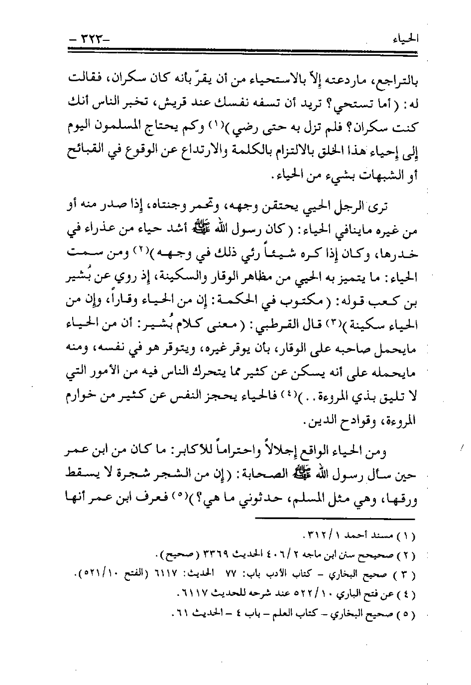 بالتراجع، ما ردعته إلا بالاستحياء من أن يقر بأنه كان سكران، فقالت له: (أما تستحيي؟ تريد أن تُسفِّه نفسك عند قريش، تخبر الناس أنك كنت سكران؟ فلم تزل به حتى رضي) (¬1)، وكم يحتاج المسلمون اليوم إلى إحياء هذا الخُلُق بالالتزام بالكلمة والارتداع عن الوقوع في القبائح أو الشبهات بشيءٍ من الحياء.