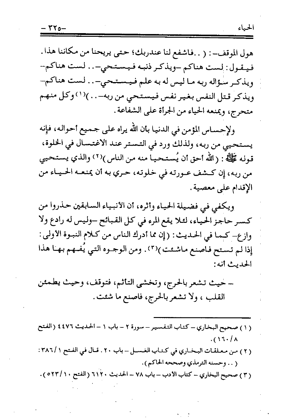 هول الموقف -: «.. فاشفَع لنا عند ربك؛ حتى يُريحَنا من مكاننا هذا، فيقول: لست هناكم - ويذكر ذنبه فيستحيي - .. لست هناكم - ويذكر سؤاله ربه ما ليس له به علم فيستحي - .. لست هناكم - ويذكر قتل النفس بغير نفس فيستحيي من ربه -» (¬1)، وكل منهم متحرج، ويمنعه الحياء من الجرأة على الشفاعة.
