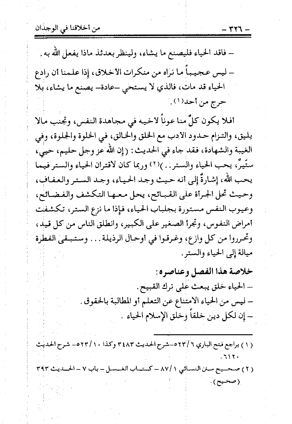 أفلا يكون كل منا عونًا لأخيه في مجاهدة النفس، وتجنُّب ما لا يليق، والتزام حدود الأدب مع الخلق والخالق، في الخلوة والجلوة، وفي الغِيبة والشهادة، فقد جاء في الحديث: «إن الله عز وجل حليم، حَيِيٌّ، ستِّير، يحب الحياء والستر ..» (¬2)، وربما كان لاقتران الحياء والستر فيما يحب الله، إشارة إلى أنه حيث وجد الحياء، وجد الستر والعفاف، وحيث تحل الجرأة على القبائح، يحل معها التكشف والفضائح وعيوب النفس مستورة بجلباب الحياء، فإذا ما نزع الستر، تكشفت أمراض النفوس، وتجرأ الصغير على الكبير، وانطلق الناس من كل قيد، وتحرَّروا من كل وازع، وغرِقوا في أوحال الرذيلة، وستبقى الفطرة ميالة إلى الحياء والستر.