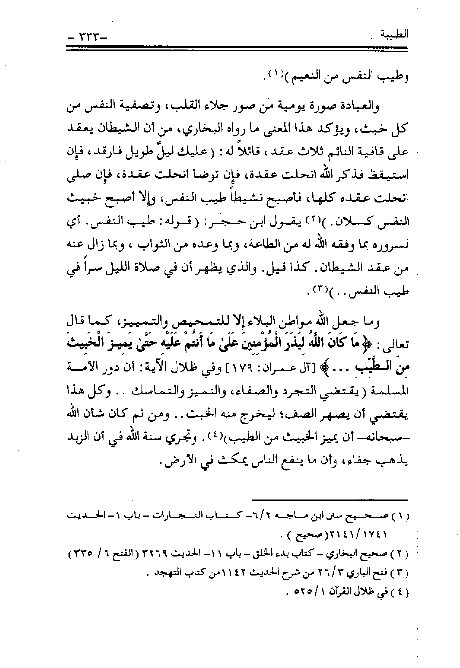 والعبادة صورة يومية من صور جلاء القلب، وتصفية النفس من كل خبث، ويؤكد هذا المعنى ما رواه البخاري، من أن الشيطان يعقد على قافية النائم ثلاث عقد، قائلاً له: «عليك ليل طويل فارقد، فإن استيقظ فذكر الله انحلت عقدة، فإن توضَّأ انحلت عقدة، فإن صلَّى انحلَّت عقده كلها، فأصبح نشيطًا طيب النفس، وإلا أصبح خبيث النفس كسلان.» (¬2).