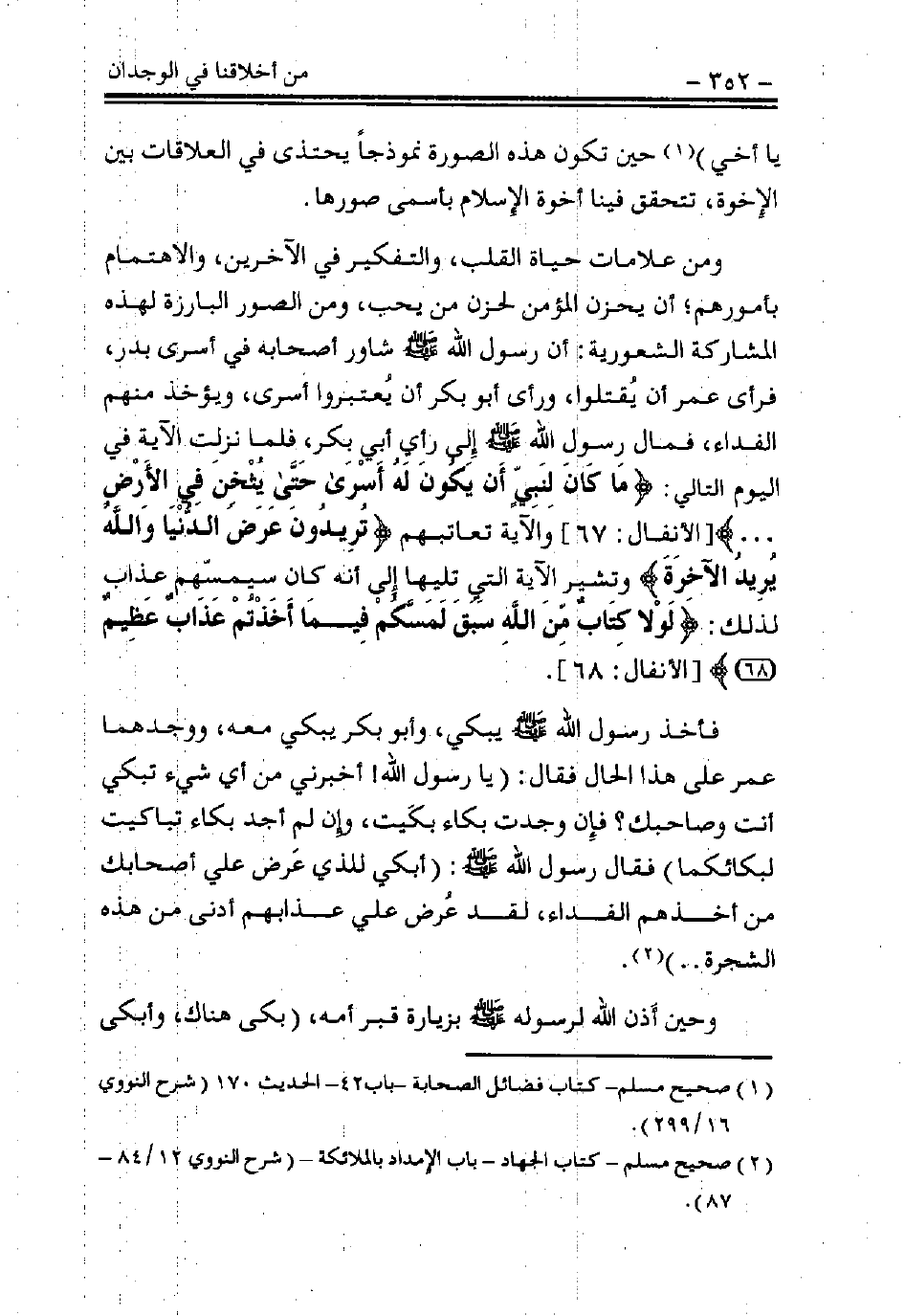 ومن علامات حياة القلب، والتفكير في الآخرين، والاهتمام بأمورهم؛ أن يحزن المؤمن لحزن من يحب، ومن الصور البارزة لهذه المشاركة الشعورية: أن رسول الله - صلى الله عليه وسلم - شاور أصحابه في أسرى بدر، فرأى عمر أن يقتلوا، ورأى أبو بكر أن يعتبروا أسرى، ويؤخذ منهم الفداء، فمال رسول الله - صلى الله عليه وسلم - إلى رأى أبي بكر، فلما نزلت الآية في اليوم التالي: {مَا كَانَ لِنَبِيٍّ أَنْ يَكُونَ لَهُ أَسْرَى حَتَّى يُثْخِنَ فِي الْأَرْضِ} [الأنفال: 67]، والآية تعاتبهم {تُرِيدُونَ عَرَضَ الدُّنْيَا وَاللَّهُ يُرِيدُ الْآَخِرَةَ}، وتشير الآية التي تليها إلى أنه كان سيَمَسُّهم عذاب لذلك: {لَوْلَا كِتَابٌ مِنَ اللَّهِ سَبَقَ لَمَسَّكُمْ فِيمَا أَخَذْتُمْ عَذَابٌ عَظِيمٌ} [الأنفال: 68].