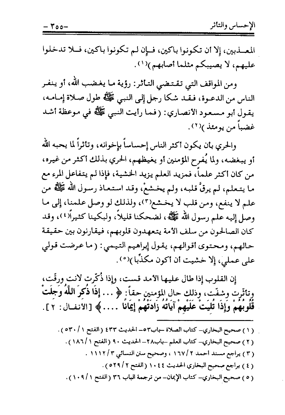 والحري بأن يكون أكثر الناس إحساسًا بإخوانه، وتأثرا لما يحبه الله أو يبغضه، ولما يفرح المؤمنين أو يغيظهم، الحري بذلك أكثر من غيره، من كان أكثر علمًان فمزيد العلم يزيد الخشية، فإذا لم يتفاعل المرء مع ما يتعلم لم يرقَّ قلبه ولم يخشع، وقد استعاذ رسول الله - صلى الله عليه وسلم - من علم لا ينفع ومن قلب لا يخشع (¬3)، ولذلك لو وصل علمنا، إلى ما وصل إليه علم رسول الله - صلى الله عليه وسلم -، لضحكنا قليلًا، ولبكينا كثيرًا (¬4)، وقد كان الصالحون من سلف الأمة يتعهدون قلوبهم، فيقارنون بين حقيقة حالهم، ومحتوى أقوالهم، يقول إبراهيم التيمي: (ما عرضت قولي على عملي، إلا خشيت أن أكون مكذبًا) (¬5).
