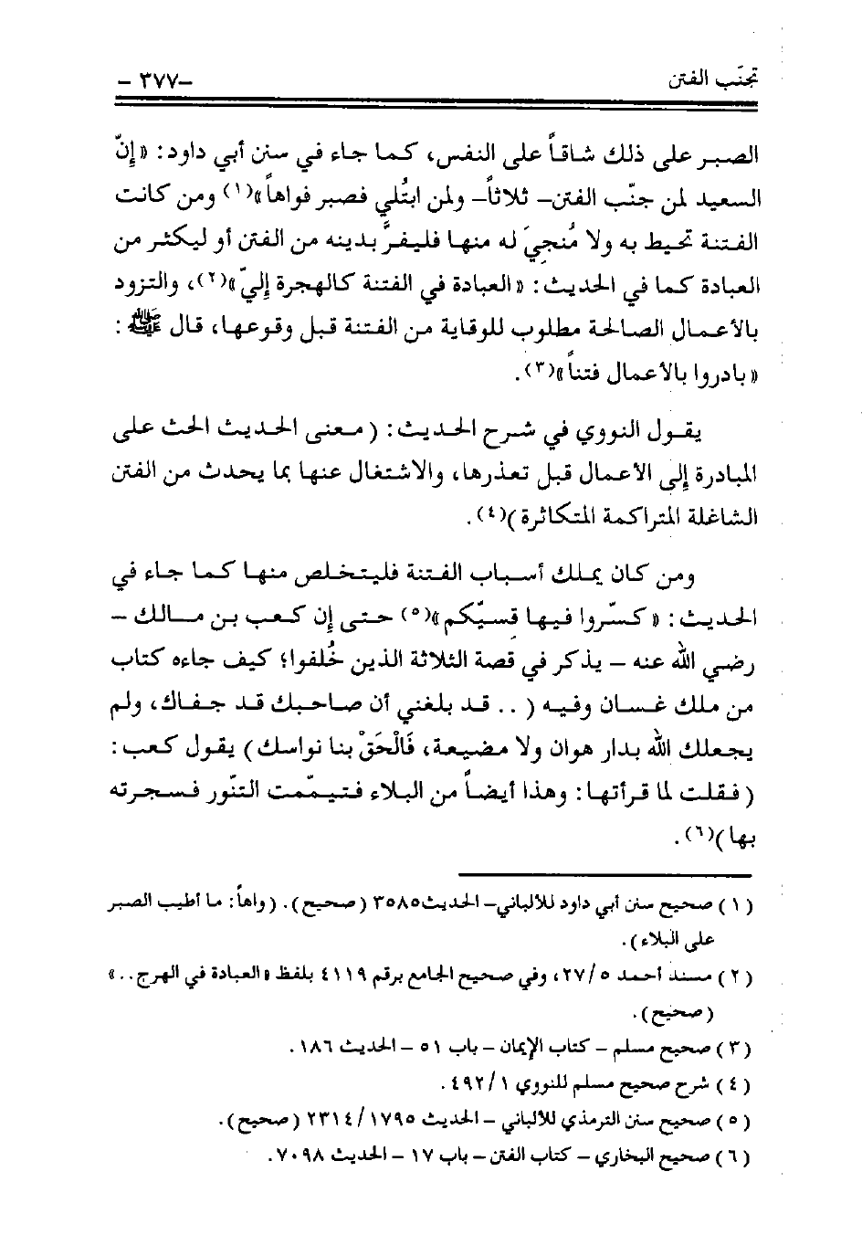 الصبر على ذلك شاقاً على النفس، كما جاء في سنن أبي داود: «إن السعيد لمن جُنِّب الفتن - ثلاثاً - ولمن ابتلي فصبر فواهاً» (¬1)، ومن كانت الفتنة تحيط به ولا مُنجِيَ به منها فليفرَّ بدينه من الفتن أو ليكثر من العبادة كما في الحديث: «العبادة في الفتنة كالهجرة إليَّ» (¬2)، والتزود بالأعمال الصالحة مطلوب للوقاية من الفتنة قبل وقوعها، قال - صلى الله عليه وسلم -: «بادروا بالأعمال فتنًا» (¬3).