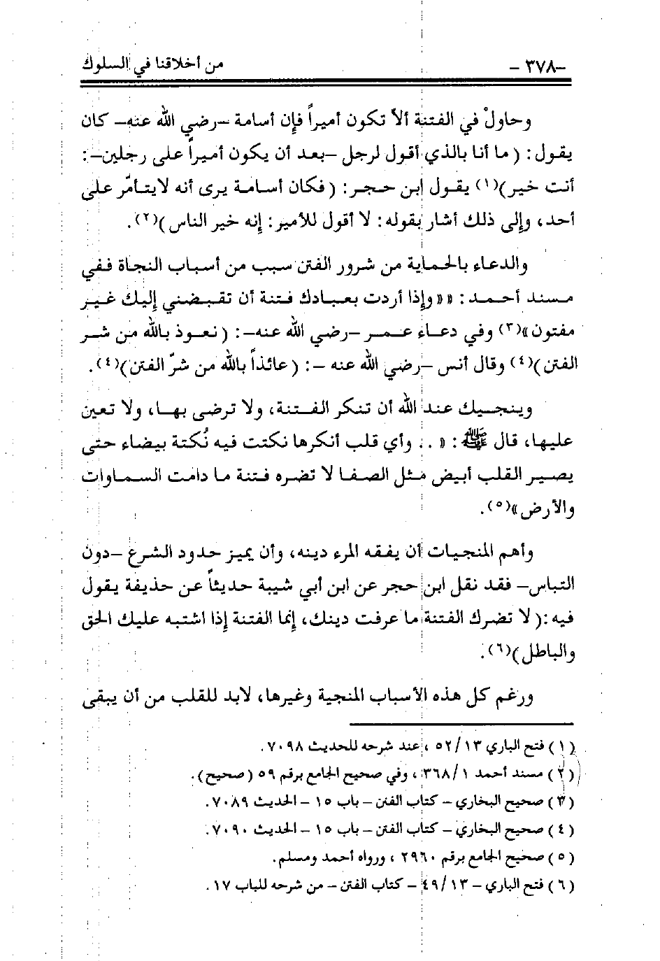 والدعاء بالحماية من شرور الفتن سبب من أسباب النجاة ففي مسند أحمد: «وإذا أردت بعبادك فتنة أن تقبضني إليك غير مفتون» (¬3)، وفي دعاء عمر - رضي الله عنه -: (نعوذ بالله من شر الفتن)، وقال أنس - رضي الله عنه -: (عائذاً بالله من شر الفتن) (¬4).