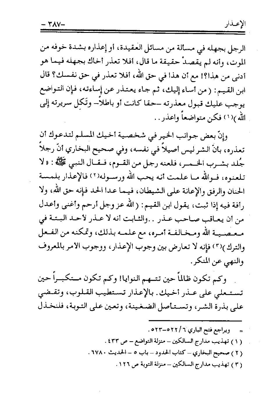 وإنَّ بعض جوانب الخير في شخصية أخيك المسلم لتدعوك أن تعذِرَه، بأن الشر ليس أصيلًا في نفسه، وفي صحيح البخاري أن رجلًا جلد بشرب الخمر، فلعنه رجل من القوم، فقال النبي - صلى الله عليه وسلم - «لا تلعنوه، فوالله ما علمت أنه يحب الله ورسوله» (¬2)، فالأعذار بلمسة الحنان والرفق والإعانة على الشيطان، فيما عدا الحد فإنه حق الله، ولا رأفة فيه إذا ثبت، يقول ابن القيم: (الله عز وجل أرحم وأغنى وأعدل من أن يعاقب صاحب عذر، والثابت أنه لا عذر لأحد البتة في معصية الله ومخالفه أمره، مع علمه بذلك، وتمكنه من الفعل والترك) (¬3)، فإنه لا تعارض بين وجوب الأعذار، ووجوب الأمر بالمعروف والنهي عن المنكر.