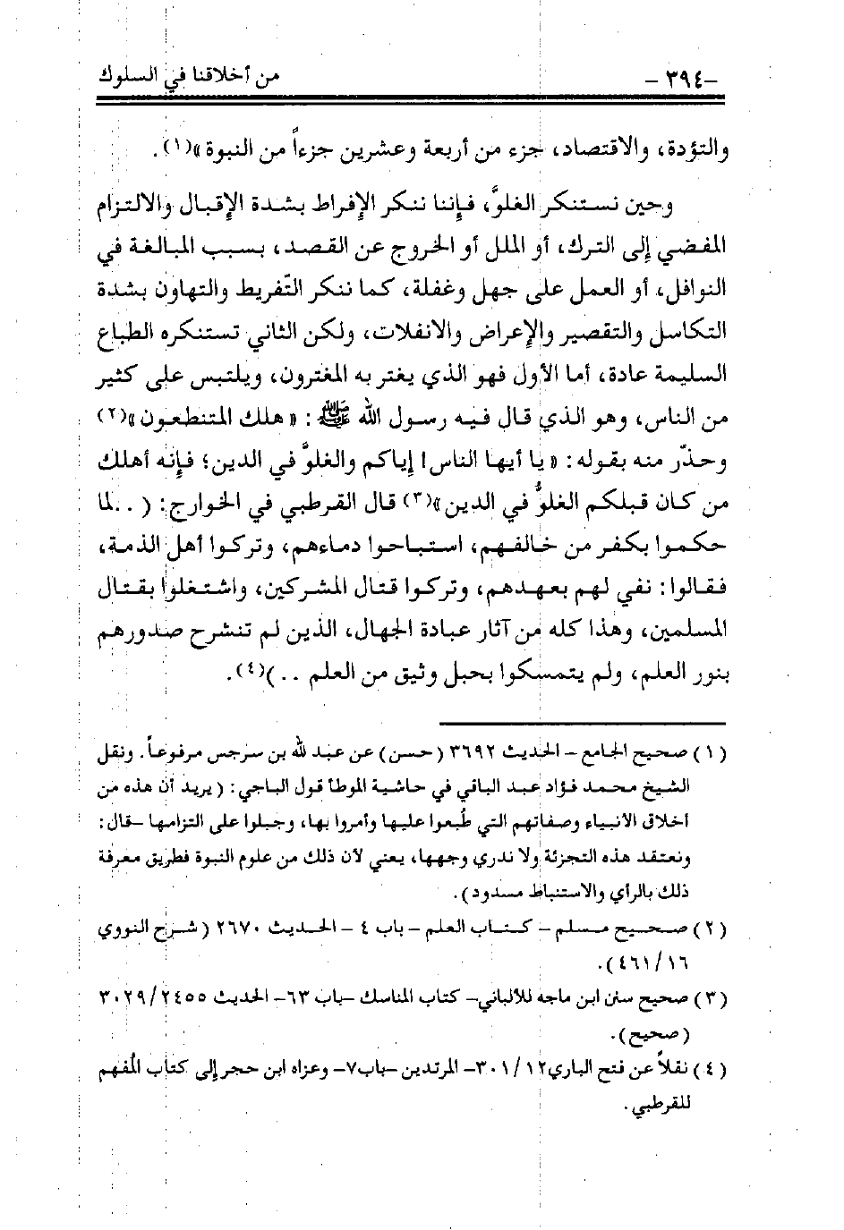 وحين نستنكر الغلو، فإننا ننكر الإفراط بشدة الإقبال والالتزام المفضي إلى الترك، أو الملل أو الخروج عن القصد، بسبب المبالغة في النوافل، أو العمل على جهل وغفلة، كما ننكر التفريط والتهاون بشدة التكاسل والتقصير والإعراض والانفلات، ولكن الثاني تستنكره الطباع السليمة عادة، أما الأول فهو الذي يغتر به النغترون، ويلتبس على كثير من الناس، وهو الذي قال فيه رسول الله - صلى الله عليه وسلم -: «هلك المتنطعون» (¬2)، وحذر منه بقوله: «يا أيها الناس، إيَّاكم والغلو في الدين؛ فإنه أهلك من كان قبلكم الغلو في الدين» (¬3)، قال القرطبي في الخوارج: (لما حكموا بكفر من خالفهم، استباحوا دماءهم، وتركوا أهل الذمة، فقالوا: نفي لهم بعهدهم، وتركوا قتال المشركين، واشتغلوا بقتال المسلمين، وهذا كله من آثار عبادة الجهال، الذين لم تنشرح صدورهم بنور العلم، ولم يتمسكوا بحبل وثيق من العلم ..) (¬4).