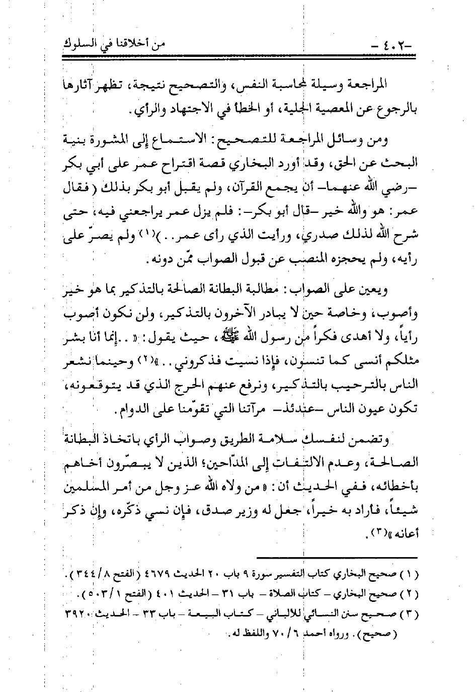 وتضمن لنفسك سلامة الطريق وصواب الرأي باتخاذ البطانة الصالحة، وعدم الالتفات إلى المدَّاحين؛ الذين لا يُبصِّرون أخاهم بأخطائه، ففي الحديث أن: «مَن ولَّاه الله عز وجل من أمر المسلمين شيئًا، فأراد به خيرًا، جعل له وزير صدق، فإن نسي ذكَّره، وإن ذكر أَعانه» (¬3).