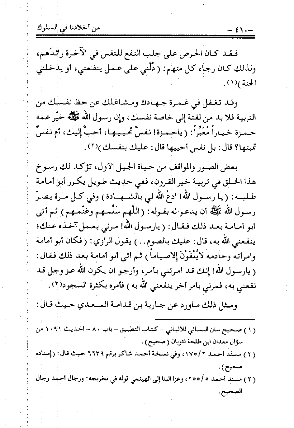 وقد تغفل في غمرة جهادك ومشاغلك عن حظ نفسك من التربية فلابد من لفتة إِلى خاصة نفسك، وإن رسول الله - صلى الله عليه وسلم - خيّر عمه حمزة خيارًا مُعِبِّرًا: «يا حمزة! نفسٌ تحييها، أحبُّ إِليك، أم نفسٌ تميتها؟ قال: بل نفس أحييها قال: عليك بنفسك» (¬2).