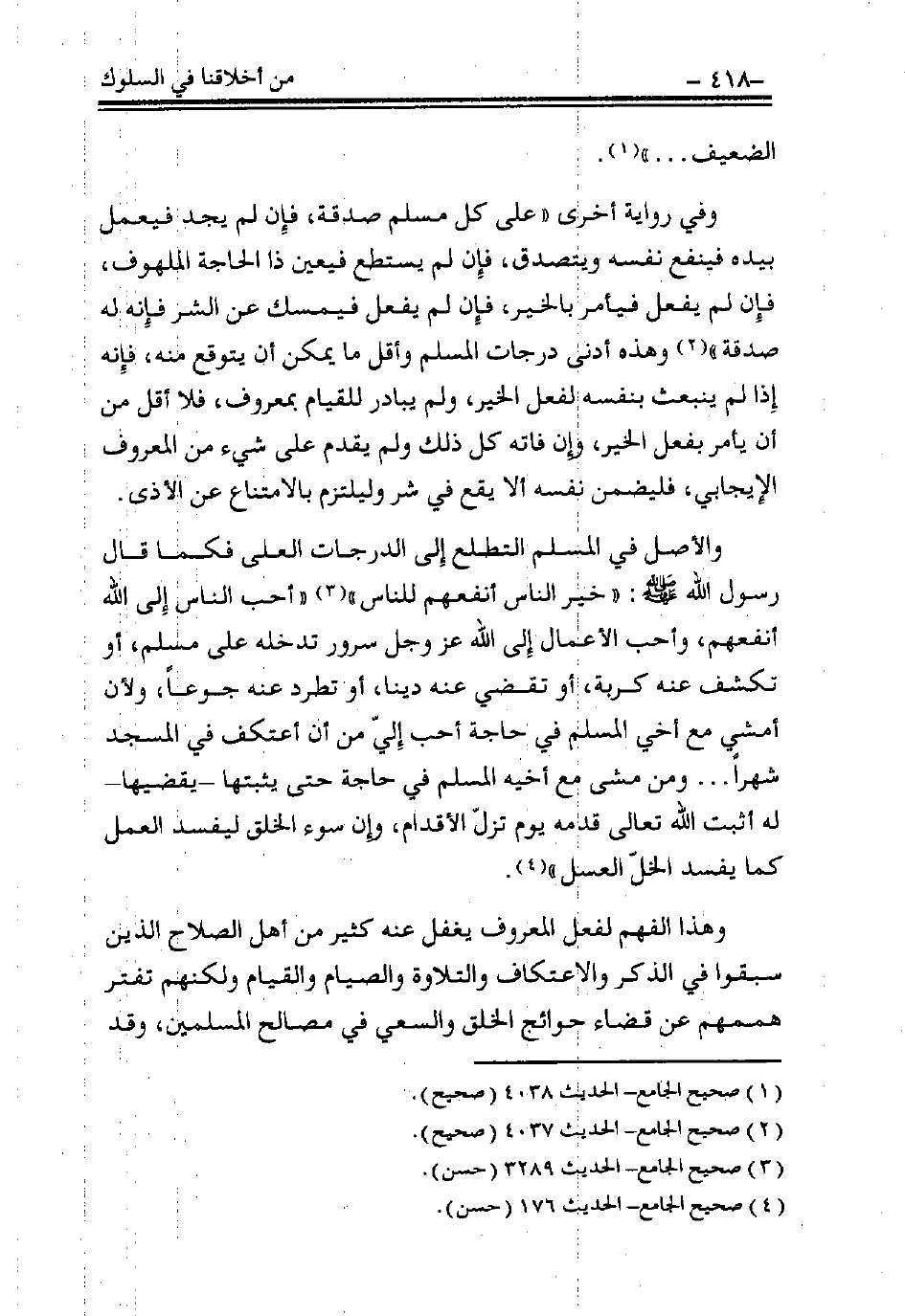 وفي رواية أخرى «على كل مسلم صدقة، فإن لم يجد فيعمل بيده فينفع نفسه ويتصدق، فإن لم يستطع فيُعِين ذا الحاجة الملهوف، فإن لم يفعل فيأمر بالخير، فإن لم يفعل فيُمسِك عن الشر فإنه له صدقة» (¬2) وهذه أدنى درجات المسلم وأقل ما يمكن أن يتوقع منه، فإنه إذا لم ينبعث بنفسه لفعل الخير، ولم يبادر للقيام بمعروف، فلا أقل من أن يأمر بفعل الخير، وإن فاته كل ذلك ولم يقدم على شيء من المعروف الإيجابي، فليضمن نفسه ألا يقع في شر وليلتزم بالامتناع عن الأذى.