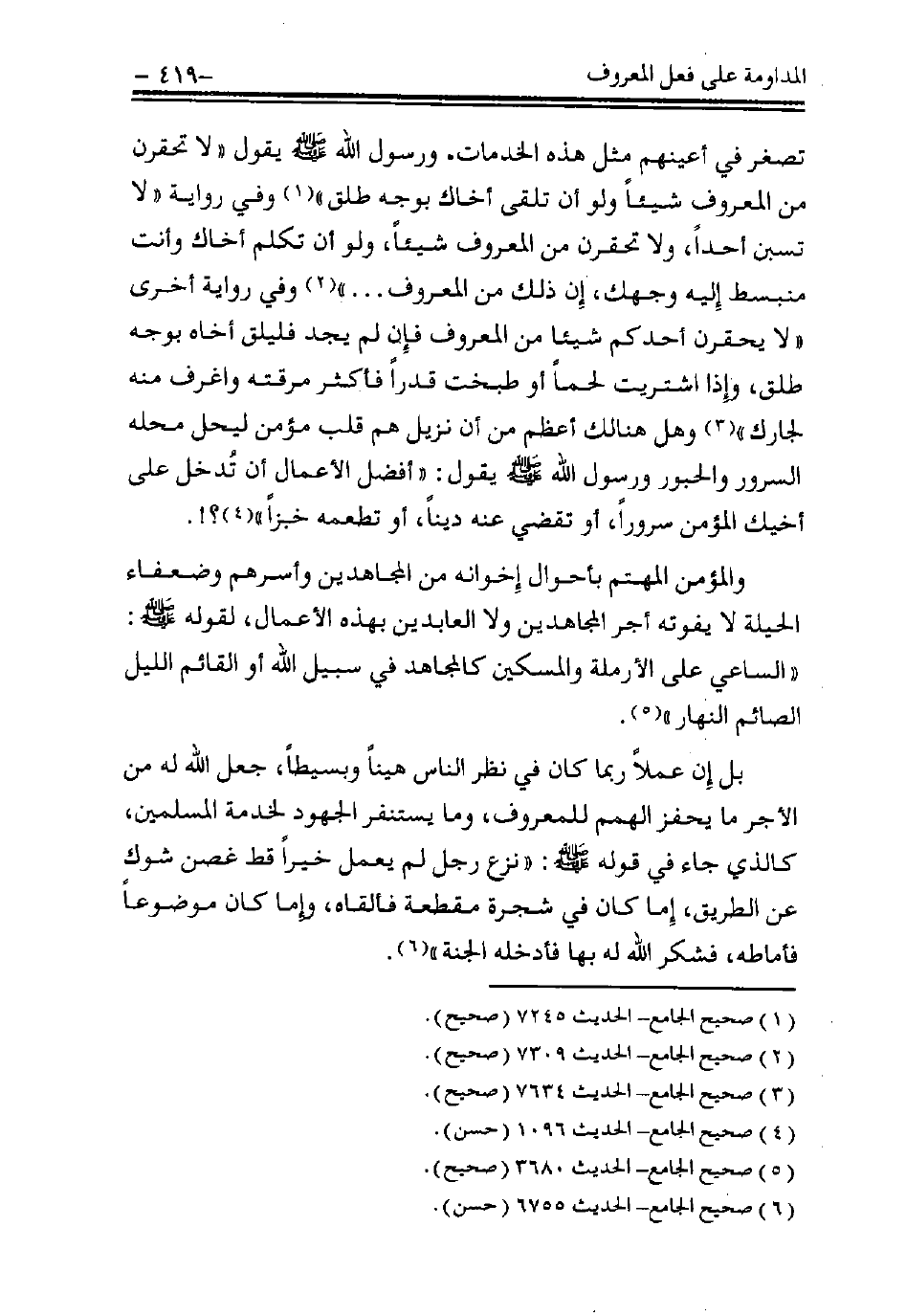 تصغر في أعينِهم مثل هذه الخدمات، ورسول الله - صلى الله عليه وسلم - يقول «لا تحقِرنَّ من المعروف شيئًا ولو أن تلقى أخاك بوجه طَلْق» (¬1)، وفي رواية «لا تسبَنَّ أحدًا، ولا تحقِرنَّ من المعروف شيئًا، ولو أن تكلم أخاك وأنت منبسط إليه وجهك، إن ذلك من المعروف ...» (¬2)، وفي رواية أخرى: «لا يحقرن أحدكم شيئًا من المعروف فإن لم يجد فليلقَ أخاه بوجه طَلْق، وإذا اشتريتَ لحمًا أو طبخت قدرًا فأكثر مرقته واغرف منه لجارك» (¬3)، وهل هنالك أعظم من أن نُزِيل همَّ قلب مؤمن ليحل محله السرور والحبور ورسول الله - صلى الله عليه وسلم - يقول: «أفضل الأعمال أن تُدخل على أخيك المؤمن سرورًا، أو تقضي عنه دينًا، أو تطعمه خبزًا» (¬4)؟!