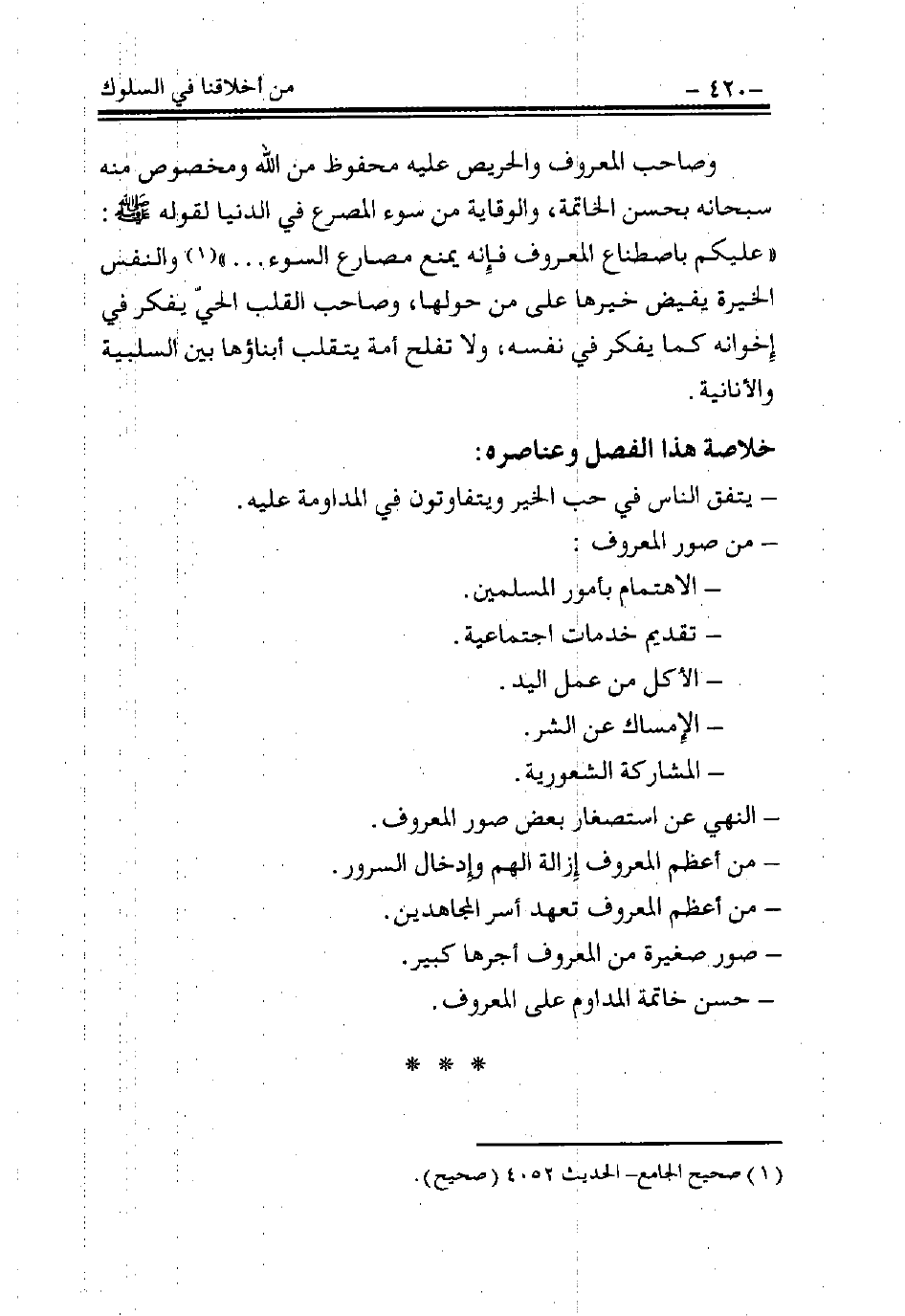 وصاحب المعروف والحريص عليه محفوظ من الله ومخصوص منه سبحانه بحسن الخاتمة، والوقاية من سوء المصرع في الدنيا لقوله - صلى الله عليه وسلم -: «عليكم باصطناع المعروف، فإنه يمنع مصارع السوء ...» (¬1)، والنفس الخيرة يفيض خيرها على من حولها، وصاحب القلب الحيِّ يفكر في إخوانه كما يفكر في نفسه، ولا تفلح أمة يتقلب أبناؤها بين السلبية والأنانية.