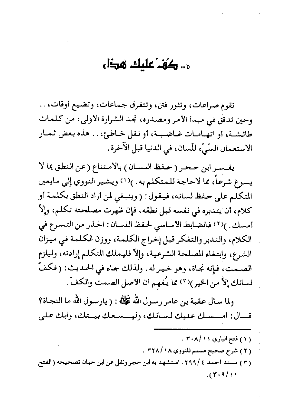 ولما سأل عقبةُ بن عامر رسولَ الله - صلى الله عليه وسلم -: «يا رسول الله، ما النجاة؟ قال: أمسِك عليك لسانك، وليسَعْك بيتك، وابكِ على