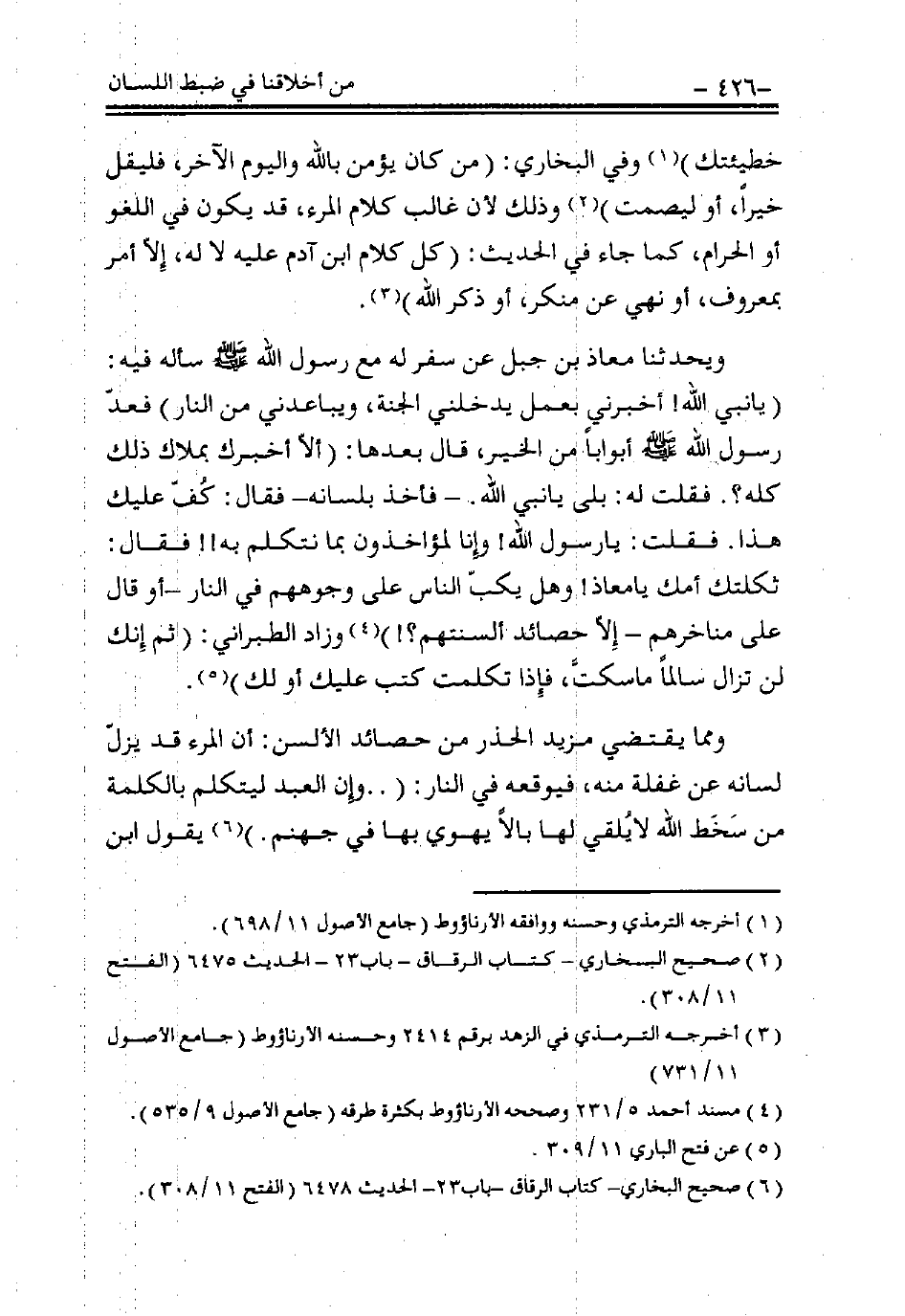 ويُحدِّثنا معاذ بن جبل عن سفر له مع رسول الله - صلى الله عليه وسلم - سأله فيه: «يا نبي الله! أخبرني بعمل يدخلني الجنة، ويباعدني من النار»، فعدَّ رسول الله - صلى الله عليه وسلم - أبوابًا من الخير، قال بعدها: «ألا أخبرك بمِلاك ذلك كله؟» فقلت له: بلى يا نبي الله؟ «- فأخذ بلسانه - فقال: كُفَّ عليك هذا»، فقلت: يا رسول الله! وإنا لمؤاخَذون بما نتكلم به! فقال: ثكِلَتْك أمك يا معاذ! وهل يكبُّ الناس على وجوهِهم في النار - أو على مناخرِهم - إلا حصائدُ ألسنتهم؟!» (¬4)، وزاد الطبراني: «ثم إنك لن تزال سالمًا ما سكتَّ، فإذا تكلمت كتب عليك أو ... لك» (¬5).