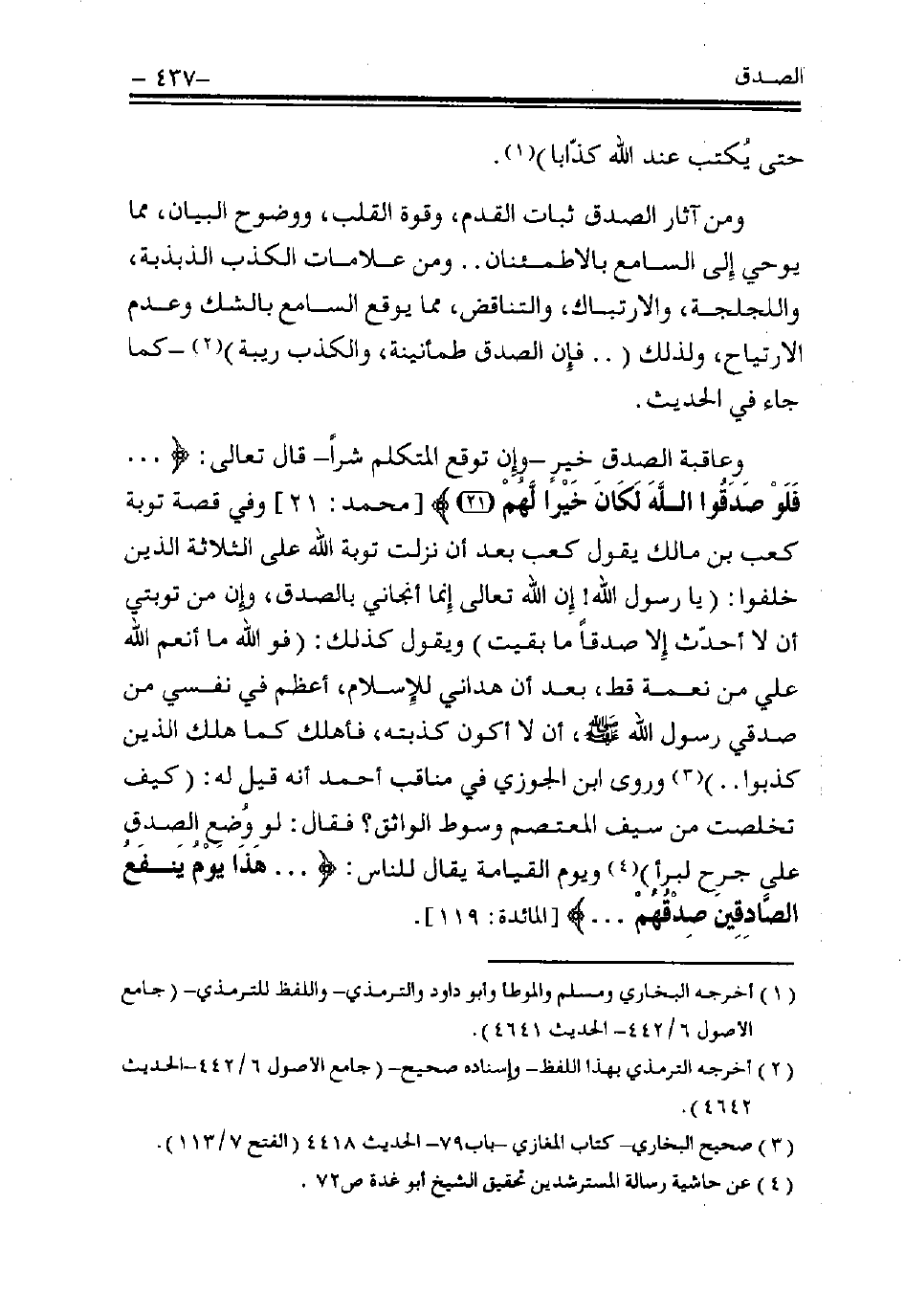وعاقبة الصدق خيرٌ - وإن توقع المتكلم شرًّا - قال تعالى: {فَلَوْ صَدَقُوا اللَّهَ لَكَانَ خَيْرًا لَهُمْ} [محمد: 21]، وفي قصة توبة كعب بن مالك يقول كعب بعد أن نزلت توبة الله على الثلاثة الذين خلفوا: (يا رسول الله، إن الله تعالى إنما أنجاني بالصدق، وإن من توبتي ألا أُحدِّث إلا صدقًا ما بقيت)، ويقول كذلك: (فو الله ما أنعم الله عليَّ من نعمة قط، بعد أن هداني للإسلام، أعظم في نفسي من صدقي رسول الله - صلى الله عليه وسلم -، أن لا أكون كذبته، فأهلك كما هلك الذين كذبوا) (¬3)، وروى ابن الجوزي في مناقب أحمد أنه قيل له: (كيف تخلَّصت من سيف المعتصم وسوط الواثق؟ فقال: لو وُضع الصدق على جرح لبرأ) (¬4)، ويوم القيامة يقال للناس: {... هَذَا يَوْمُ يَنْفَعُ الصَّادِقِينَ صِدْقُهُمْ ...} [المائدة: 119].