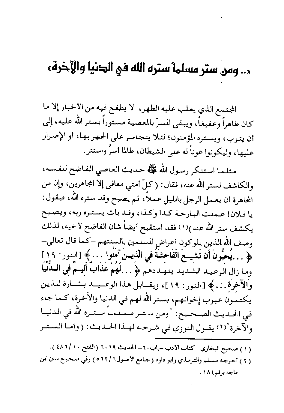 المجتمع الذي يغلب عليه الطُّهر، لا يطفح فيه من الأخبار إلا ما كان طاهرًا وعفيفًا، ويبقى المسرُّ بالمعصية مستورًا بستر الله عليه، إلى أن يتوب، ويستره المؤمنون؛ لئلا يتجاسر على الجهر بها، أو الإصرار عليها، وليكونوا عونًا له على الشيطان، طالما أسرَّ واستتر.
