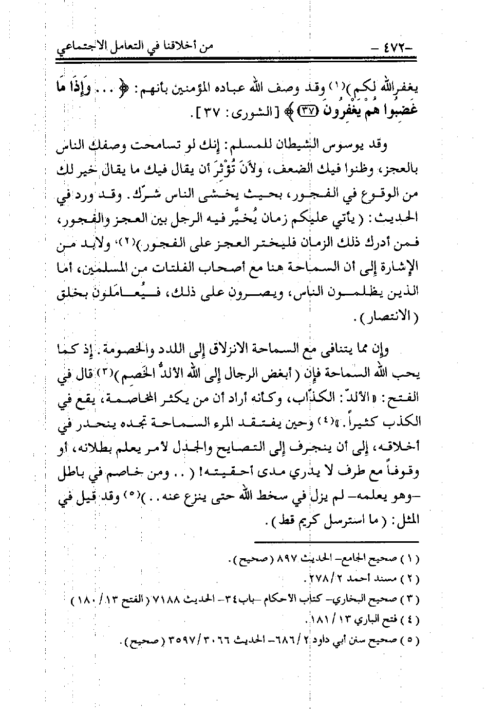 وقد يوسوس الشيطان للمسلم: إنك لو تسامحت وصفك الناس بالعجز، وظنوا فيك الضعف؛ ولأن تُؤثرَ أن يقال فيك ما يقال خير لك من الوقوع في الفجور، بحيث يخشى الناس شرَّك، وقد ورد في الحديث: «يأتي عليكم زمان يُخيَّر فيه الرجل بين العجز والفجور، فمن أدرك هذا الزمان فليختَرِ العجز على الفجور» (¬2)، ولابد من الإشارة إلى أن السماحة هنا مع أصحاب الفلتات من المسلمين، أما الذين يظلمون الناس، ويصرُّون على ذلك، فيُعامَلون بخلق (الانتصار).