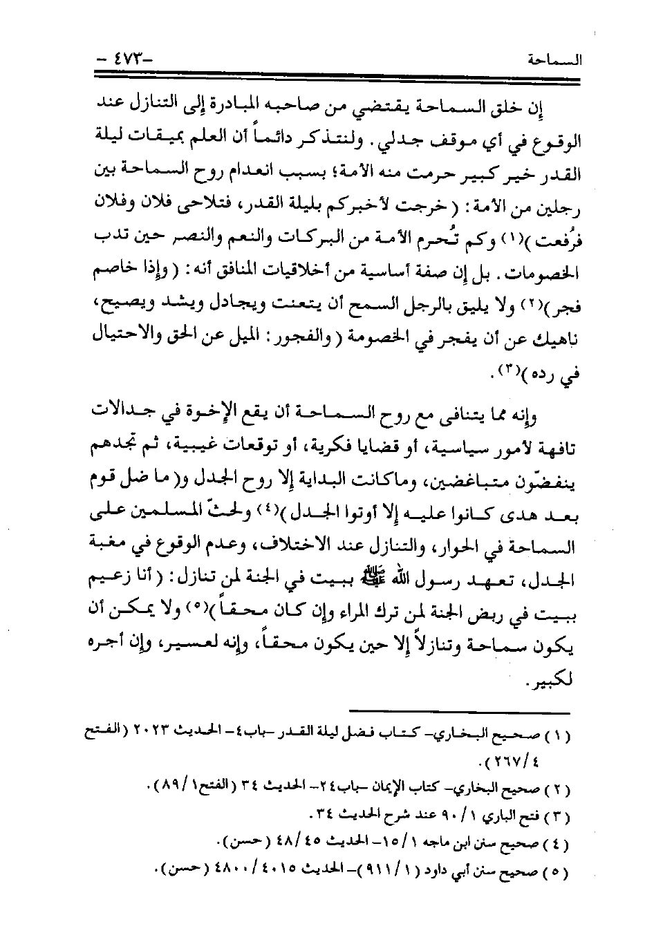 إن خُلُق السماحة يقتضي من صاحبه المبادرة إلى التنازل عند الوقوع في أي موقف جدلي، ولنتذكر دائمًا أن العلم بميقات ليلة القدر خير كبير حُرِمت منه الأمة؛ بسبب انعدام روح السماحة بين رجلين من الأمة: «خرجتُ لأُخبِركم بليلة القدر، فتلاحى فلان وفلان فرُفِعت» (¬1)، وكم تُحرم الأمة من البركات والنِّعم والنصر حين تدبُّ الخصومات، بل إن صفة أساسية من أخلاقيات المنافق أنه: «وإذا خاصم فجر» (¬2)، ولا يليق بالرجل السمح أن يتعنَّت ويجادل ويشد ويَصِيح، ناهيك عن أن يفجر في الخصومة (والفجور: الميل عن الحق والاحتيال في رده) (¬3).