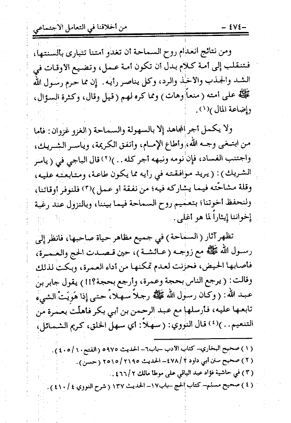ولا يكمل أجر المجاهد إلا بالسهولة والسماحة «الغزو غزوان: فأما مَن ابتغى وجه الله، وأطاع الإمام، وأنفق الكريمة، وياسر الشريك، واجتنب الفساد، فإن نومه ونبهه أجر كله» (¬2)، قال الباجي في (ياسر الشريك): (يريد موافقته في رأيه مما يكون طاعة، ومتابعته عليه، وقلة مشاحّته فيما يشاركه فيه؛ من نفقة أو عمل) (¬3)، فلنوفر أوقاتنا، ولنحفظ أخوتنا؛ بتعميم روح السماحة فيما بيننا، وبالنزول عند رغبة إخواننا إيثارًا لما هو أغلى.