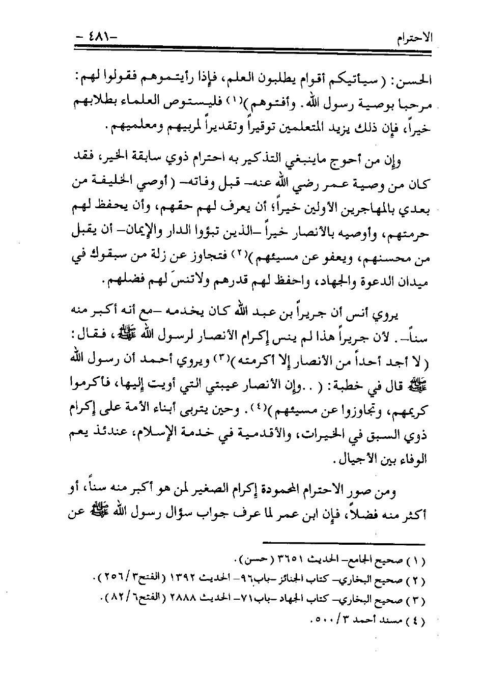 يروي أنس أن جرير بن عبد الله كان يخدمه مع أنه أكبر منه سنًّا؛ لأن جريرًا هذا لم ينسَ إكرام الأنصار لرسول الله - صلى الله عليه وسلم -، فقال: (لا أجد أحدًا من الأنصار إلا أكرمته) (¬3)، ويروي أحمد أن رسول الله - صلى الله عليه وسلم - قال في خطبة: «وإن الأنصار عيبتي التي أويت إليها، فأكرموا كريمهم، وتجاوزوا عن مسيئهم» (¬4)، وحين يتربَّى أبناء الأمة على إكرام ذوي السبق في الخيرات، والأقدمية في خدمة الإسلام، عندئذٍ يعم الوفاء بين الأجيال.