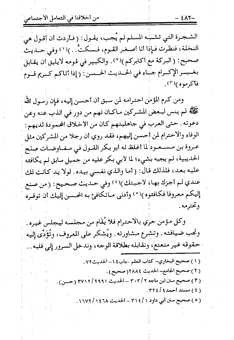 ومن كرمِ المؤمن احترامُه لمن سبق أن أحسن إليه، فإن رسول الله - صلى الله عليه وسلم - لم ينسَ لبعض المشركين ما كان لهم من دور في الذبِّ عنه وعن دعوته، حتى العرب في جاهليتهم كان من الأخلاق المحمودة لديهم: الوفاء والاحترام لمن أحسن إليهم، فقد روي أن رجلًا من المشركين مثل عروة بن مسعود لما أغلظ له أبو بكر القول في مفاوضات صلح الحُدَيْبية، لم يجبه بشيء؛ لما لأبي بكر عليه من جميل سابق لم يكافئه عليه بعد، فلذلك قال: (أما والذي نفسي بيده. لولا يد كانت لك عندي لم أجزك بها، لأجبتك) (¬4)، وفي حديث صحيح: «من صنع إليكم معروفًا فكافئوه» (¬5) وأدنى ما تُكافِئ به المحسن إليك أن توقره وتحترمه.