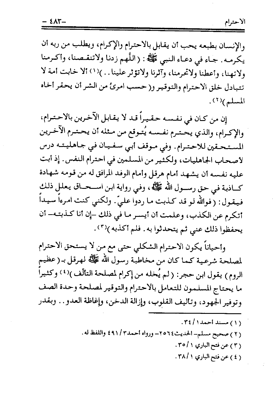 والإنسان بطبعه يحب أن يقابل بالاحترام والإكرام، ويطلب من ربه أن يكرمه. جاء في دعاء النبي - صلى الله عليه وسلم -: «اللَّهم زِدْنا ولا تنقصنا، وأكرمنا ولا تُهِنَّا، وأعطِنا ولا تحرمنا، وآثرنا ولا تؤثر علينا» (¬1)، ألا خابت أمة لا تتبادل خلق الاحترام والتوقير، و «حسب امرئُ من الشر أن يحقر أخاه المسلم» (¬2).