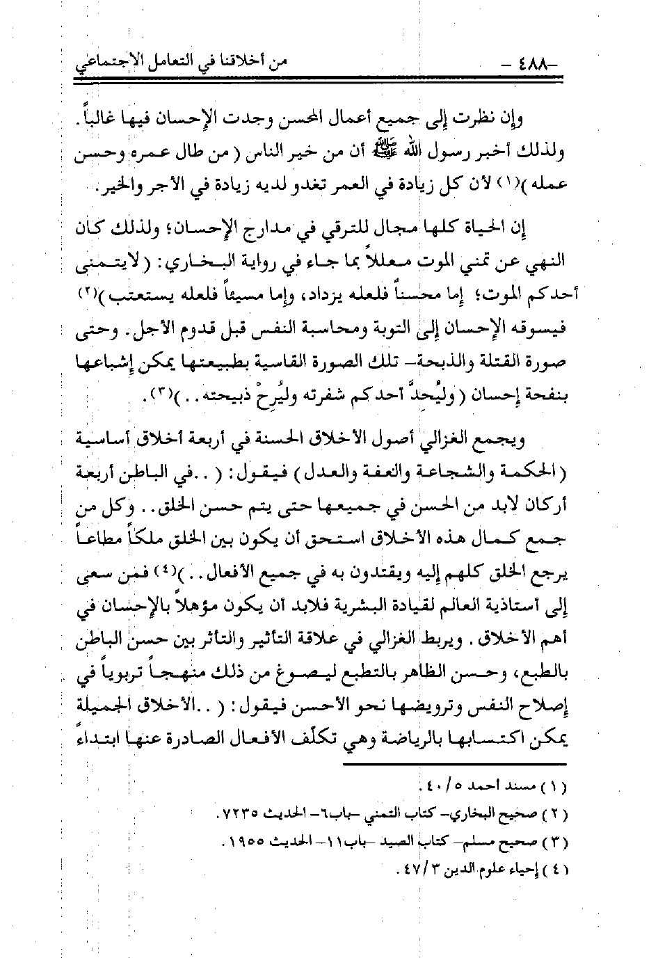 إن الحياة كلها مجال للترقي في مدارج الإحسان؛ ولذلك كان النهي عن تمني الموت معللًا بما جاء في رواية البخاري: «لا يتمنَّى أحدكم الموت؛ إما محسنًا فلعله يزداد، وإما مسيئًا فلعله يستعتب» (¬2)، فيسوقه الإحسان إلى التوبة ومحاسبة النفس قبل قدوم الأجل، وحتى صورة القتلة والذبحة - تلك الصورة القاسية بطبيعتها يمكن إشباعها بنفحة إحسان: «وليحدَّ أحدُكم شفرتَه وليُرِحْ ذبيحته» (¬3).