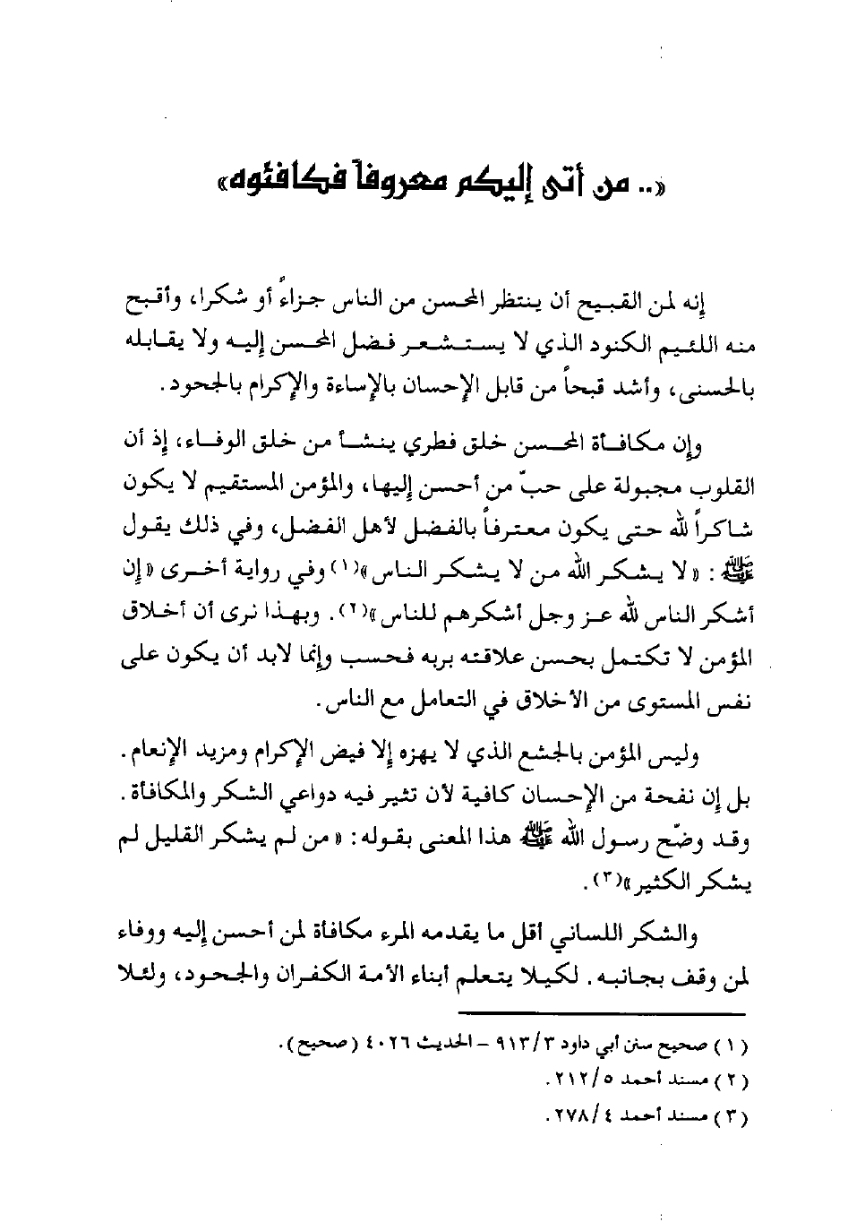 وإن مكافأة المحسن خُلق فطري ينشأ من خلق الوفاء، إذ أن القلوب مجبولة على حب من أحسن إليها، والمؤمن المستقيم لا يكون شاكرًا لله حتى يكون معترفًا بالفضل لأهل الفضل، وفي ذلك يقول - صلى الله عليه وسلم -: «لا يشكر الله من لا يشكر الناس» (¬1)، وفي رواية أخرى: «إن أشكر الناس لله عز وجل أشكرهم للناس» (¬2)، وبهذا نرى أن أخلاق المؤمن لا تكتمل بحسن علاقته بربه فحسب وإنما لا بدَّ أن يكون على نفس المستوى من الأخلاق في التعامل مع الناس.