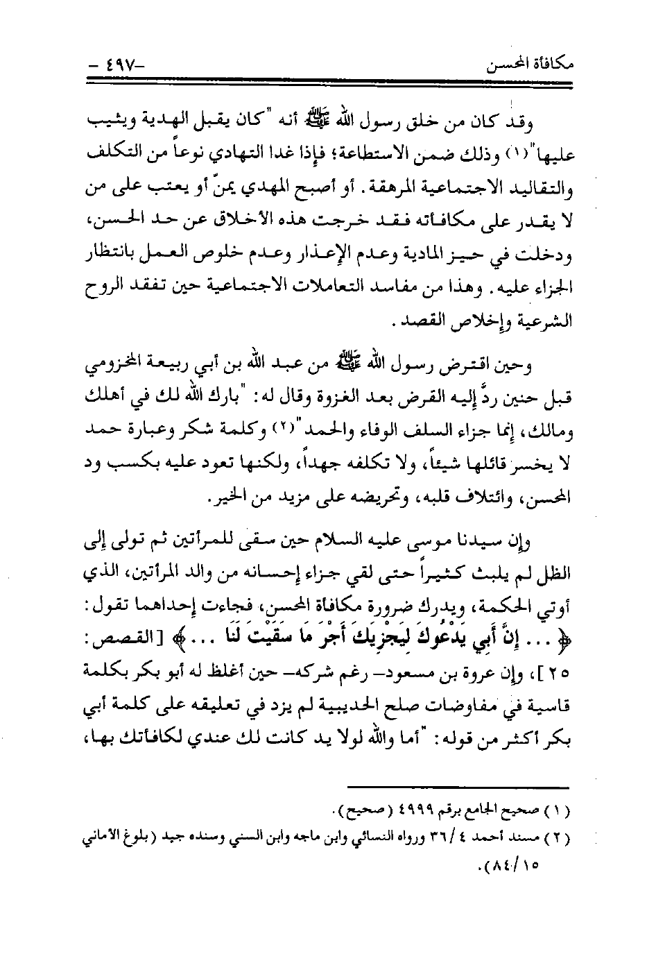 وإن سيدنا موسى عليه السلام حين سقى للمرأتين، ثم تولى إلى الظل لم يلبث كثيرًا حتى لقي جزاء إحسانه من والد المرأتين، الذي أوتي الحكمة، ويدرك ضرورة مكافأة المحسن، فجاءت إحداهما تقول: {... إنَّ أَبِي يَدْعُوكَ لِيَجْزِيَكَ أَجْرَ مَا سَقَيْتَ لَنَا ...} [القصص: 25]، وإن عُروة بن مسعود - رغم شركه - حين أغلظ له أبو بكر بكلمة قاسية في مفاوضات صلح الحديبية لم يزد في تعليقه على كلمة أبي بكر أكثر من قوله: «أما والله، لولا يد كانت لك عندي لكافأتك بها،
