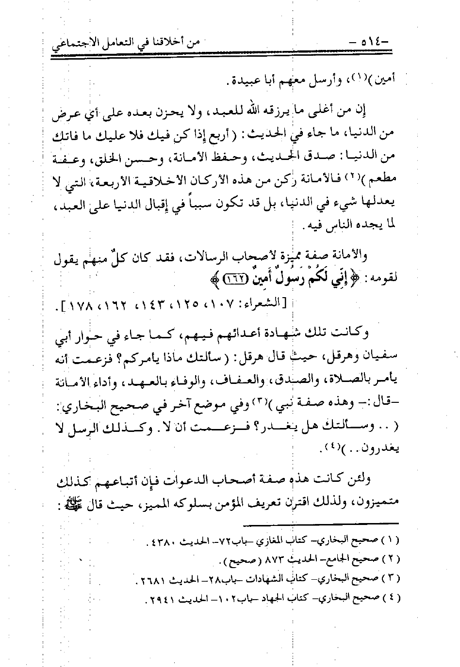 وكانت تلك شهادة أعدائهم فيهم، كما جاء في حوار أبي سفيان وهرقل، حيث قال هرقل: (سألتُك ماذا يأمركم؟ فزعمت أنه يأمر بالصلاة، والصدق، والعفاف، والوفاء بالعهد، وأداء الأمانة - قال: - وهذه صفة نبي) (¬3)، وفي موضع آخر في صحيح البخاري: (وسألتُك هل يغدر؟ فزعمت أن لا، وكذلك الرسل لا يغدرون) (¬4).