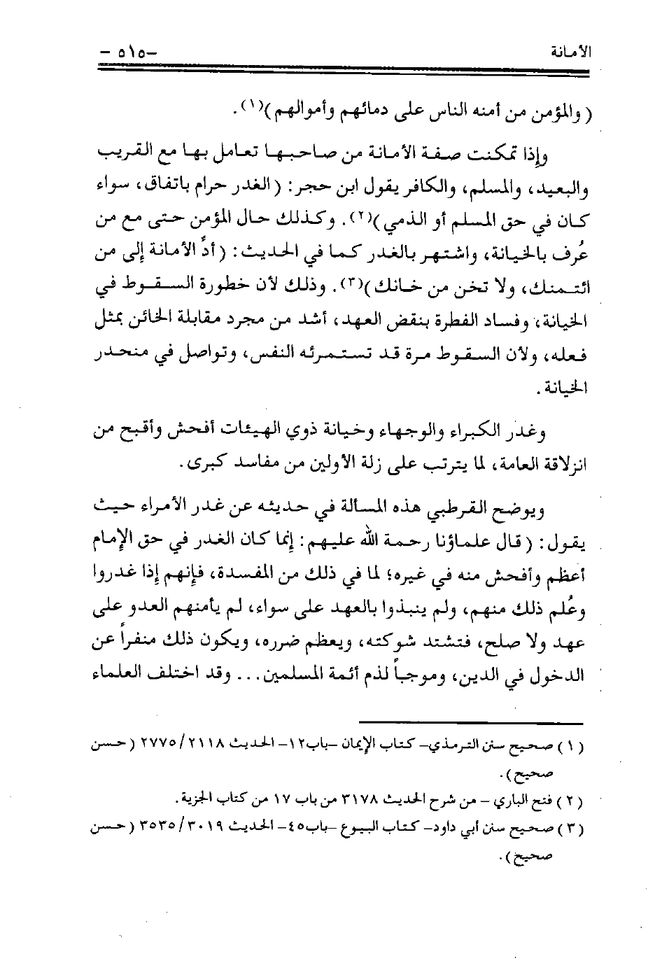 وإذا تمكَّنت صفة الأمانة من صاحبها تعامل بها مع القريب والبعيد، والمسلم، والكافر يقول ابن حجر: (الغدر حرام باتفاق، سواء كان في حق المسلم أو الذمي) (¬2)، وكذلك حال المؤمن حتى مع مَن عُرف بالخيانة، واشتهر بالغدر كما في الحديث: «أد الأمانة إلى من ائتمنك، ولا تخن من خانك» (¬3)؛ وذلك لأن خطورة السقوط في الخيانة، وفساد الفطرة بنقض العهد، أشد من مجرد مقابلة الخائن بمثل فعله؛ ولأن السقوط مرة قد تستمرِئُه النِّفس، وتواصل في منحدر الخيانة.