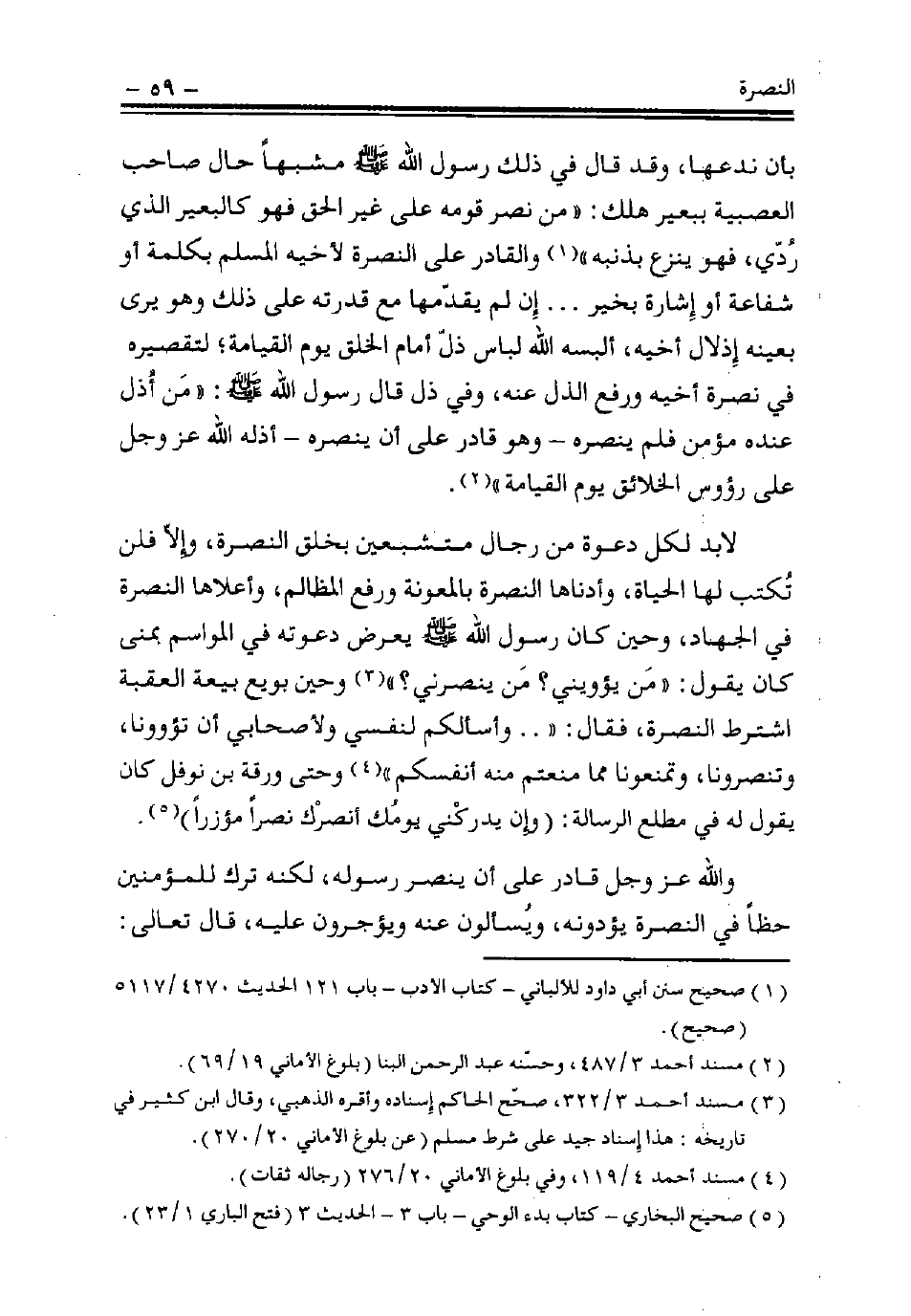 لابد لكل دعوة من رجال متشبعين بخلق النصرة، وإلا فلن تكتب لها الحياة، وأدناها النصرة بالمعونة ورفع المظالم، وأعلاها النصرة في الجهاد، وحين كان رسول الله - صلى الله عليه وسلم - يعرض دعوته في المواسم بمنى كان يقول: «مَن يُؤويني؟ مَن ينصرني؟» (¬3).