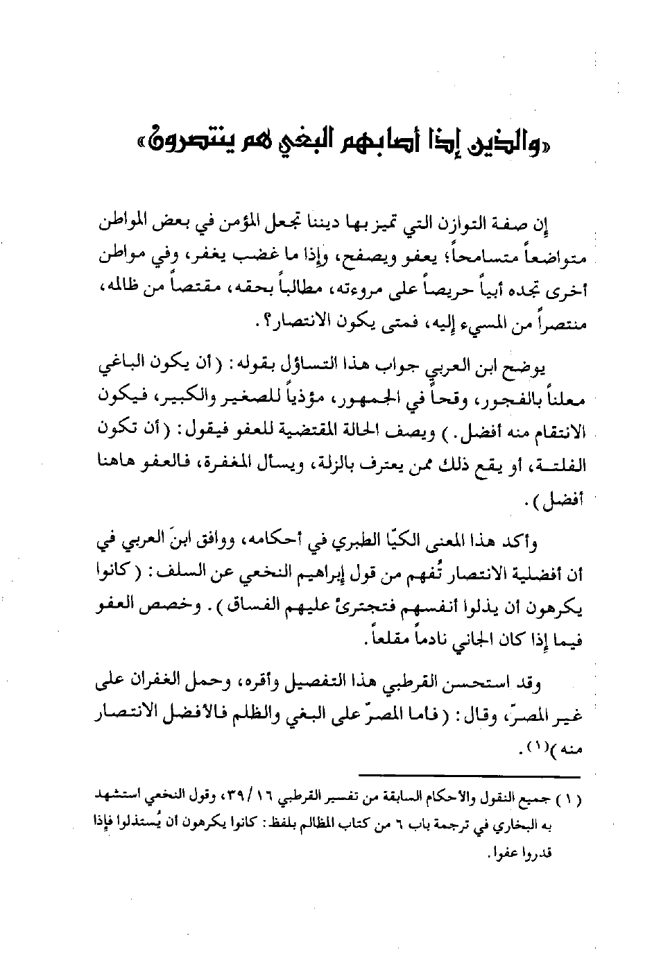 (¬1) جميع النقول والأحكام السابقة من تفسير القرطبي 16/ 39، وقول النخعي استشهد به البخاري في ترجمة باب 6 من كتاب المظالم بلفظ: كانوا يكرهون أن يُستذلوا فإذا قدروا عفوا.
