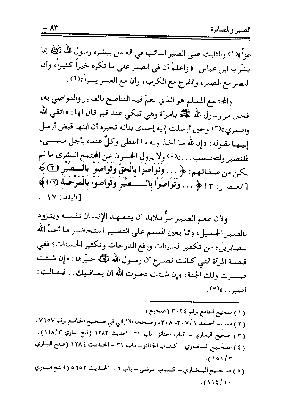 والمجتمع المسلم هو الذي يعم فيه التناصح بالصبر والتواصي به، فحين مر رسول الله - صلى الله عليه وسلم - بامرأة وهي تبكي عند قبر قال لها: «اتقي الله واصبري» (¬3)، وحين أرسلت إليه إحدى بناته تخبره أن ابنها قُبِض أرسل إليها بقوله: «إن لله ما أخذ وله ما أعطى وكل عنده بأجل مسمى، فلتصبر ولتحتسب ...» (¬4).