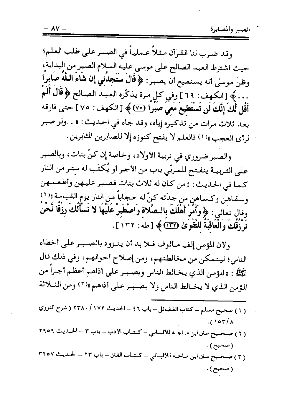 وقد ضرب لنا القرآن مثلًا عمليًّا في الصبر على طلب العلم؛ حيث اشترط العبد الصالحُ على موسى عليه السلام الصبرَ من البداية، وظن موسى أنه يستطيع أن يصبر: {قَالَ سَتَجِدُنِي إِن شَاءَ اللَّهُ ...} [الكهف: 69]، وفي كل مرة يُذكِّره العبد الصالح {قَالَ أَلَمْ أَقُل لَّكَ إِنَّكَ لَن تَسْتَطِيعَ مَعِيَ صَبْرًا} [الكهف: 75]، حتى فارقه بعد ثلاث مرات من تذكيره إياه، وقد جاء في الحديث: «.. ولو صبر لرأى العجب» (¬1)، فالعلم لا يفتح كنوزه إلا للصابرين المثابرين.