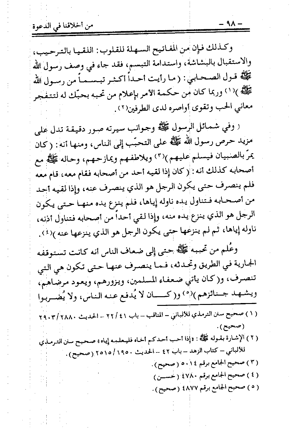 (وفي شمائل الرسول - صلى الله عليه وسلم - وجوانب سيرته صور دقيقة تدل على مزيد حرص رسول الله - صلى الله عليه وسلم - على التحبب إلى الناس، ومنها أنه: (كان يمر بالصبيان فيسلم عليهم) (¬3)، ويلاطفهم ويمازحهم، وحاله - صلى الله عليه وسلم - مع أصحابه كذلك أنه: (كان إذا لقيه أحد من أصحابه فقام معه، قام معه فلم ينصرف حتى يكون الرجل هو الذي ينصرف عنه، وإذا لقيه أحد من أصحابه، فتناول يده ناوله إياها، فلم ينزع يده منها حتى يكون الرجل هو الذي ينزع يده منه، وإذا لقي أحدًا من أصحابه فتناول أذنه، ناوله إياها، ثم لم ينزعها حتى يكون الرجل هو الذي ينزعها عنه) (¬4).