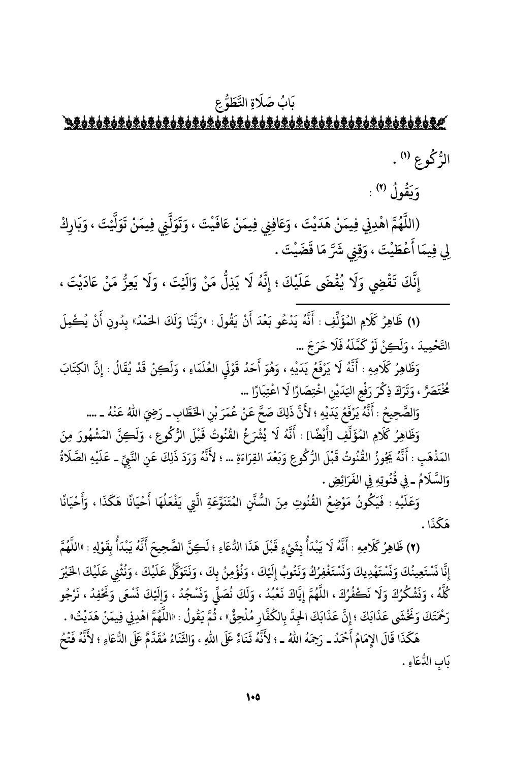 (¬1) ظاهر كلامه: أنه لا يبدأ بشيءٍ قبل هذا الدعاء؛ لكن الصحيح أنه يبدأ بقوله: «اللهم إنا نستعينك ونستهديك ونستغفرك ونتوب إليك، ونؤمن بك، ونتوكل عليك، ونثني عليك الخير كله، ونشكرك ولا نكفرك، اللهم إياك نعبد، ولك نصلي ونسجد، وإليك نسعى ونحفد، نرجو رحمتك ونخشى عذابك؛ إن عذابك الجد بالكفار ملحقٌ»، ثم يقول: «اللهم اهدني فيمن هديت».
