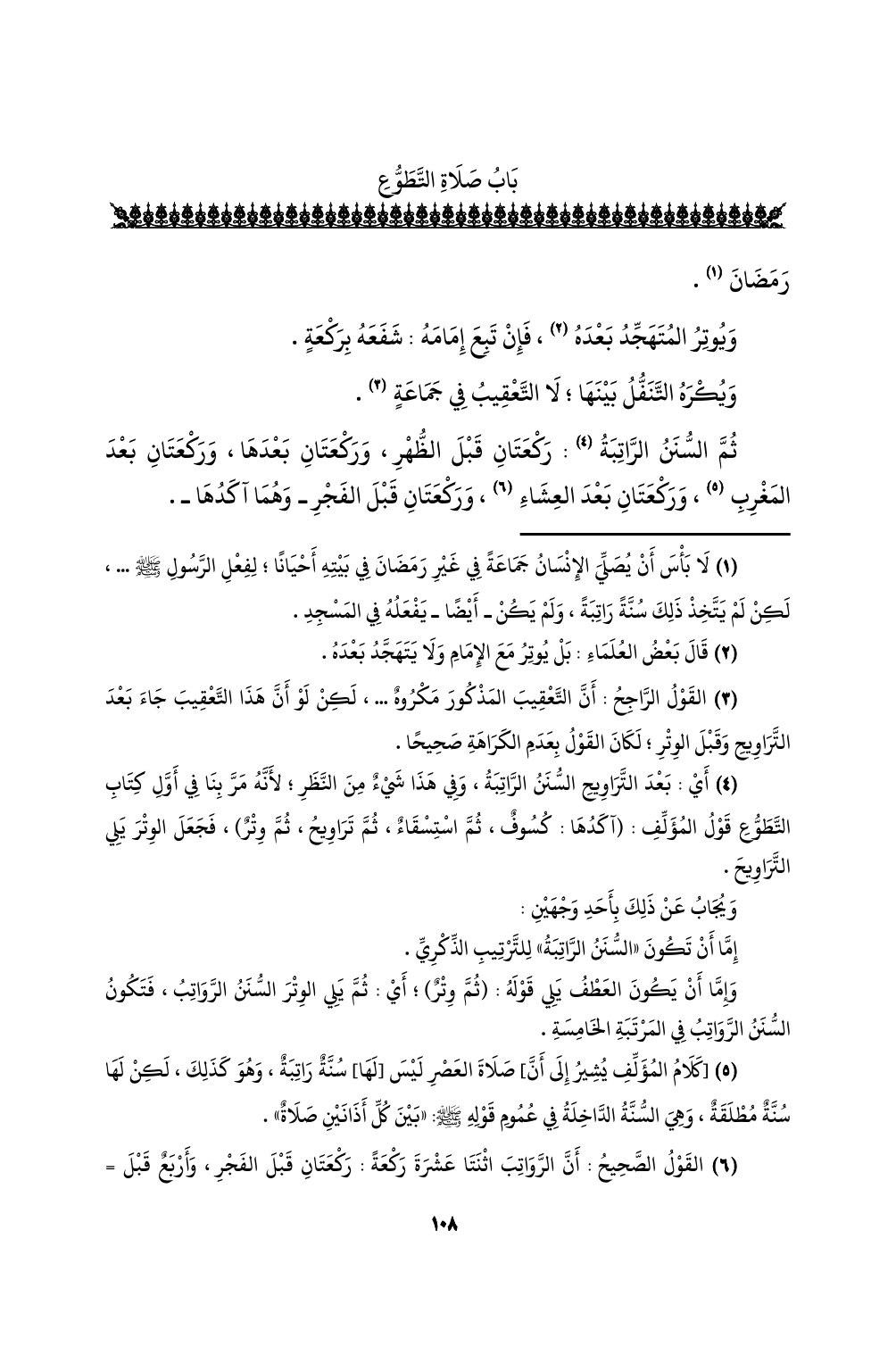 (¬4) أي: بعد التراويح السنن الراتبة، وفي هذا شيءٌ من النظر؛ لأنه مر بنا في أول كتاب التطوع قول المؤلف: (آكدها: كسوفٌ، ثم استسقاءٌ، ثم تراويح، ثم وترٌ)، فجعل الوتر يلي التراويح.