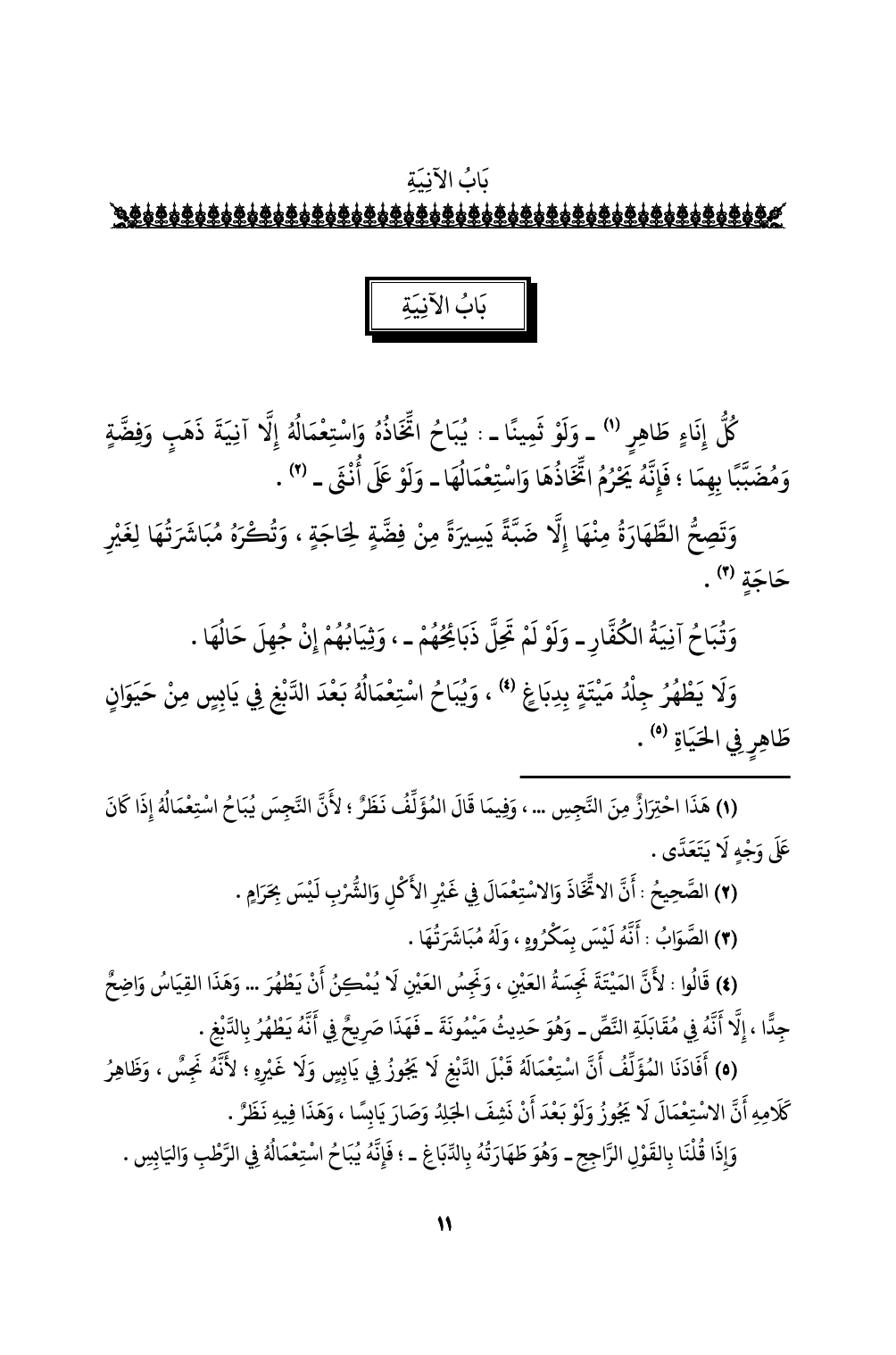 (¬5) أفادنا المؤلف أن استعماله قبل الدبغ لا يجوز في يابسٍ ولا غيره؛ لأنه نجسٌ، وظاهر كلامه أن الاستعمال لا يجوز ولو بعد أن نشف الجلد وصار يابسًا، وهذا فيه نظرٌ.