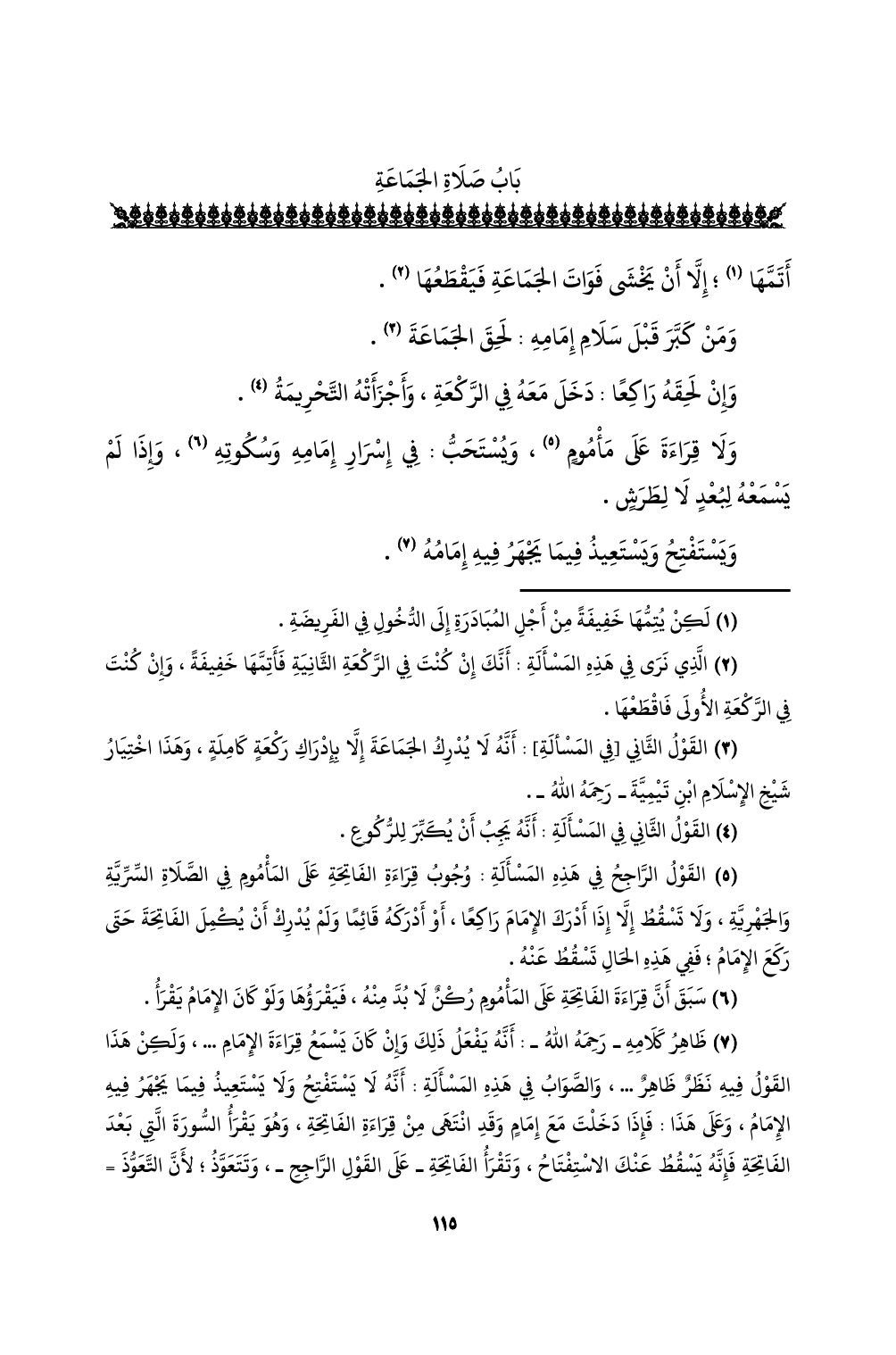 (¬6) سبق أن قراءة الفاتحة على المأموم ركنٌ لا بد منه، فيقرؤها ولو كان الإمام يقرأ.