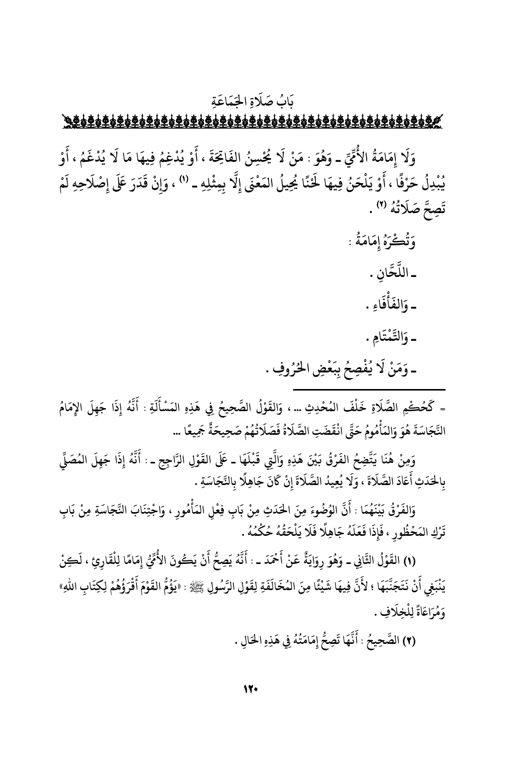 (¬1) القول الثاني - وهو روايةٌ عن أحمد -: أنه يصح أن يكون الأمي إمامًا للقارئ، لكن ينبغي أن نتجنبها؛ لأن فيها شيئًا من المخالفة لقول الرسول صلى الله عليه وسلم: «يؤم القوم أقرؤهم لكتاب الله» ومراعاةً للخلاف.