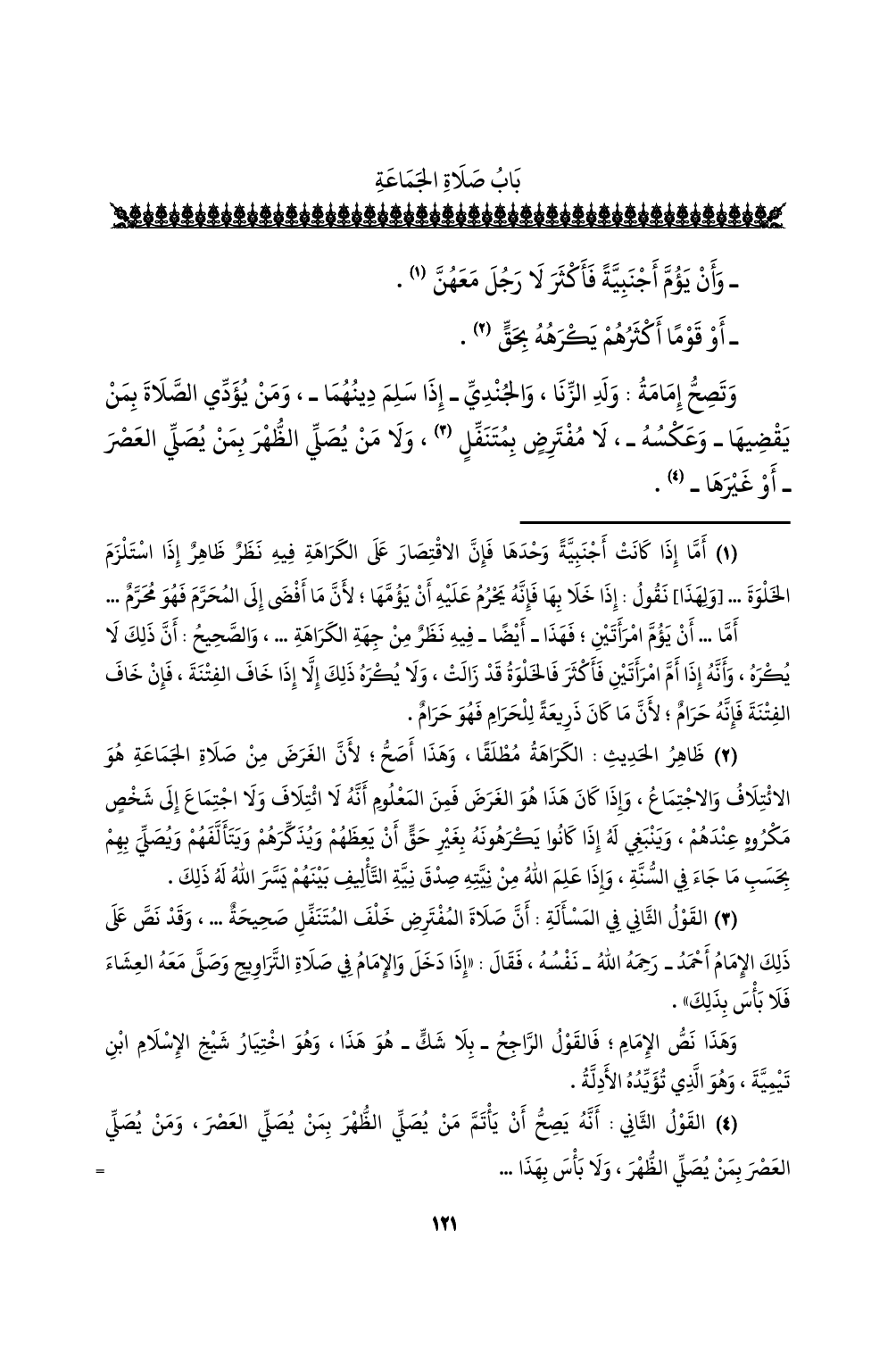 (¬1) أما إذا كانت أجنبيةً وحدها فإن الاقتصار على الكراهة فيه نظرٌ ظاهرٌ إذا استلزم الخلوة ... [ولهذا] نقول: إذا خلا بها فإنه يحرم عليه أن يؤمها؛ لأن ما أفضى إلى المحرم فهو محرمٌ ...